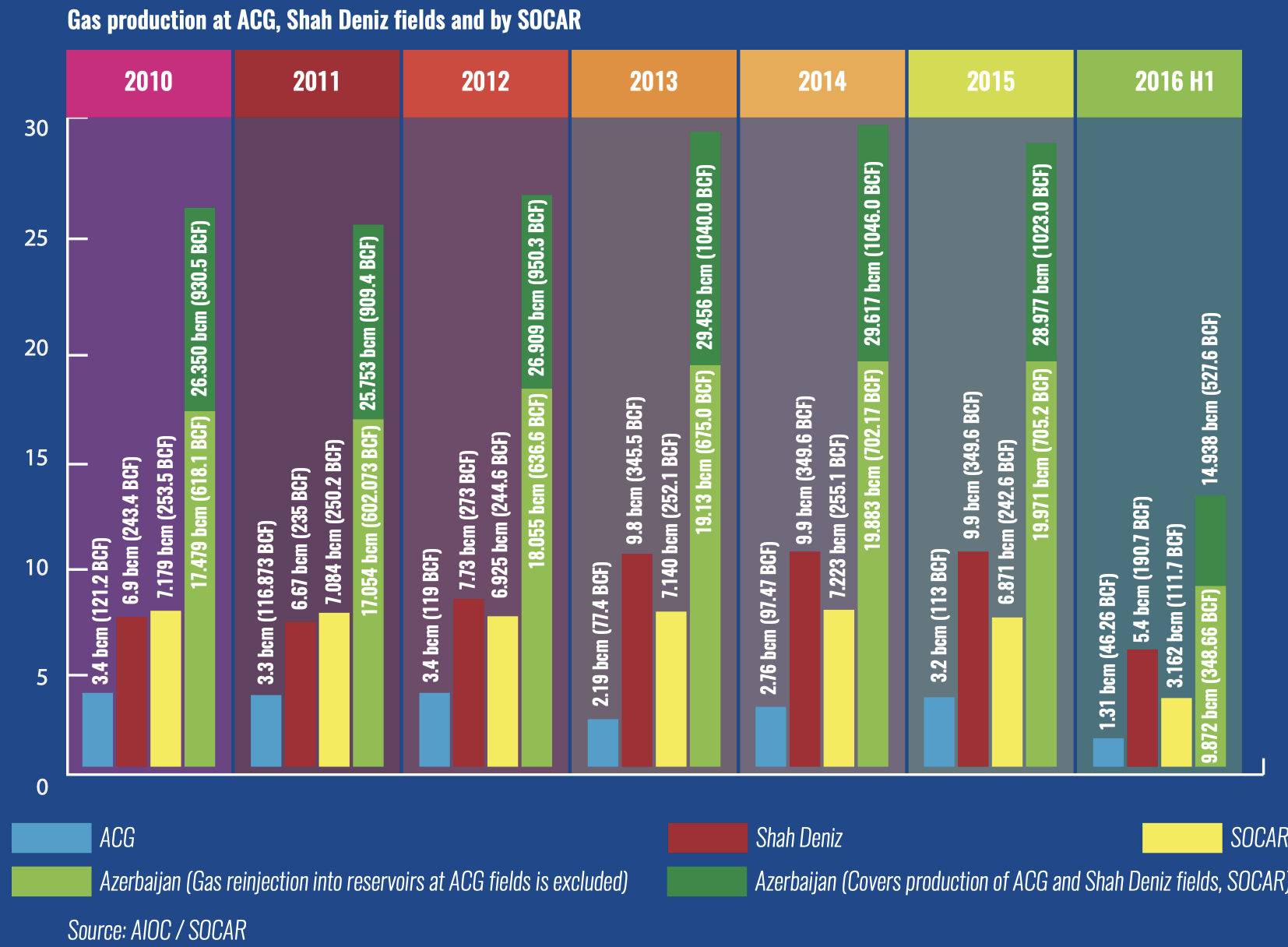Unfortunately, considering the current situation, everything that Azerbaijan can anticipate from its strategic industry is only a natural oil production decline, that is to say, its maintenance through injection of gas volumes similar to the annual amount of gas produced by SOCAR (see the info graphic on pages 23-24). There are following factors causing it.