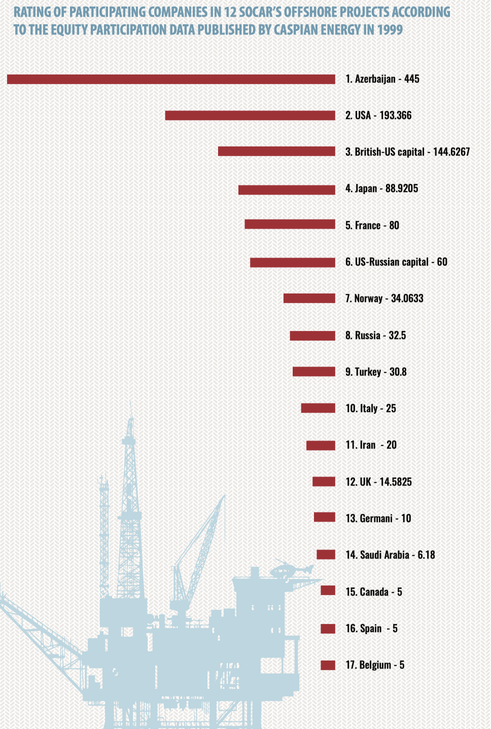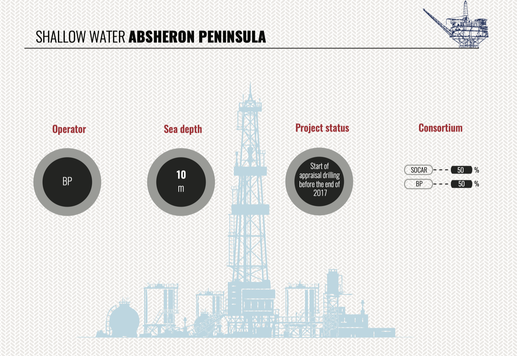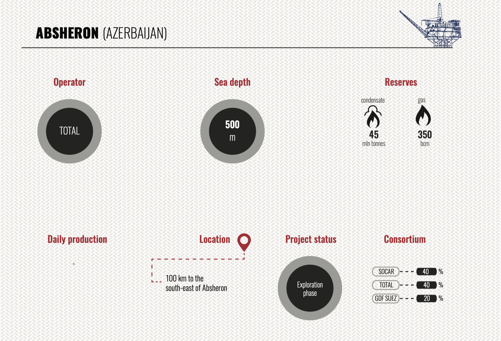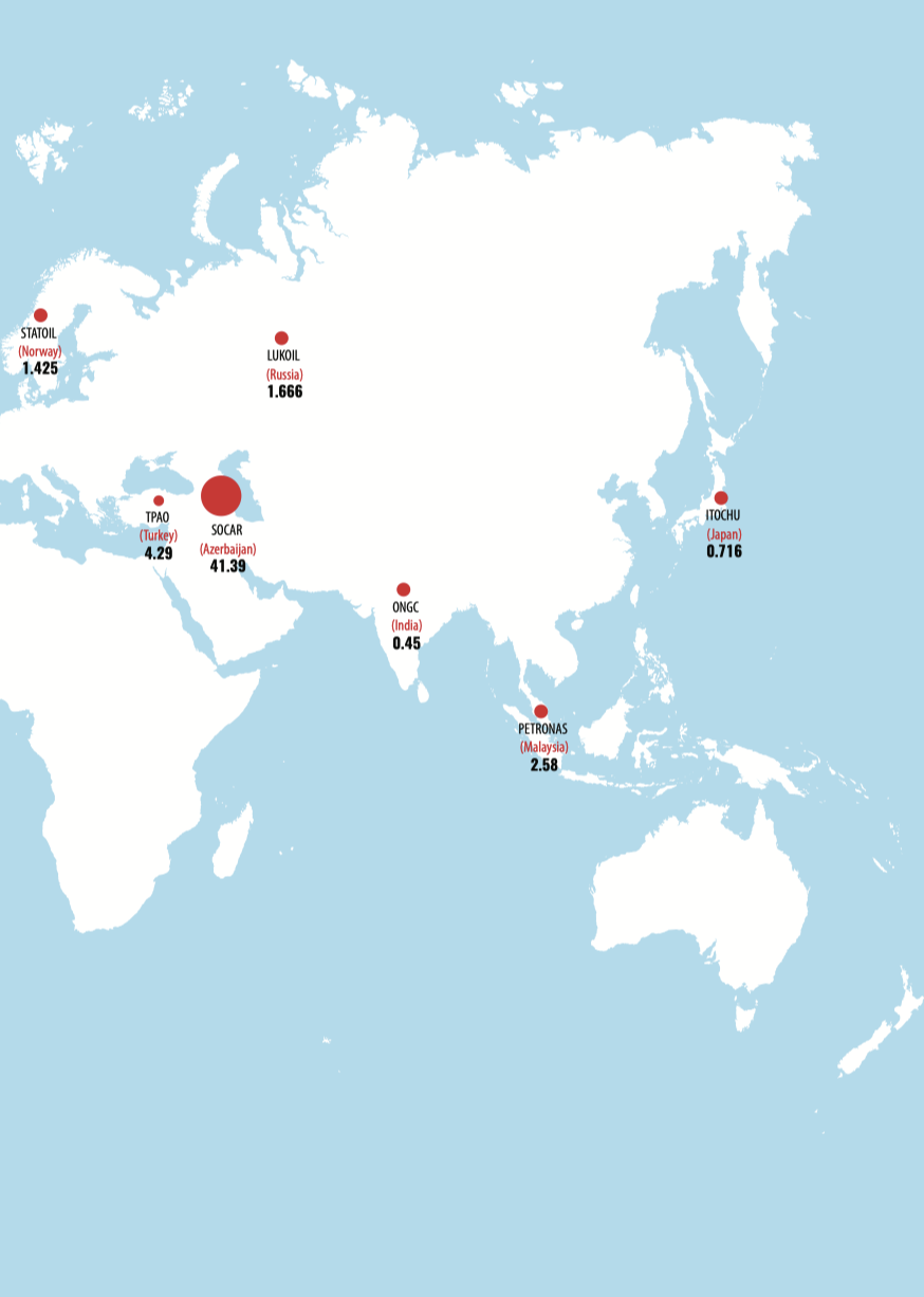 Compiling the investment rating of companies performing oil-gas operations in the Caspian fields, we have split the rating into three parts in order to provide a complete picture of the present pattern of investing in oil-gas operations in the Caspian, a high potential of Caspian fields and promising areas in current hard market conditions. The first part covers old Caspian fields(some of them have been under development for 100 (!) years, there is no analogue for it in the world now), the second one covers relatively new investment projects in Azerbaijan and on the Caspian in general, where production is already running. And the third part includes fields discovered by foreign consortiums in the Azeri sector late in the 20th century and projects on them were closed just because the result of exploration and further appraisal revealed mainly gas bearing deposits which used to be considered commercially unfavourable at that period.