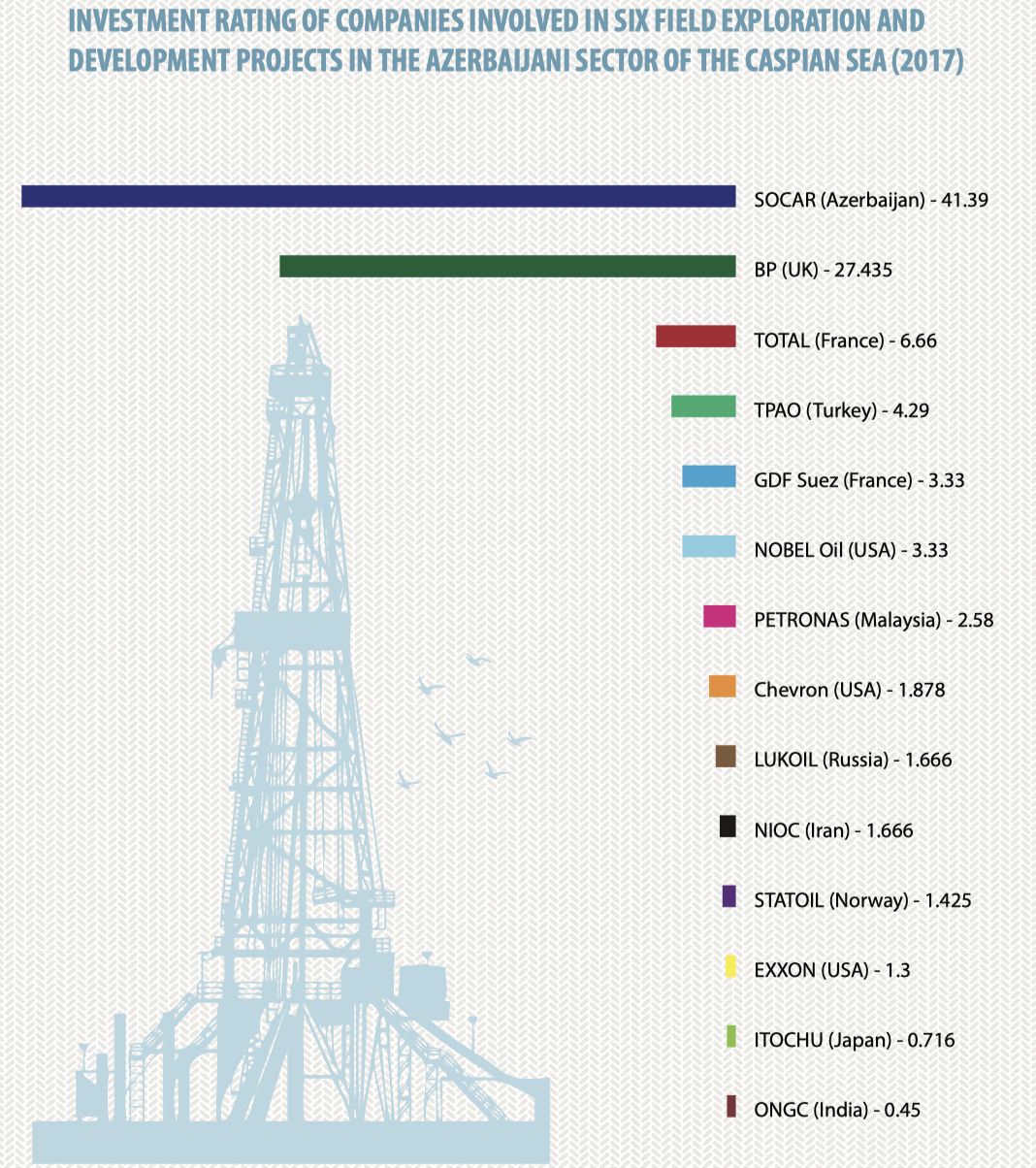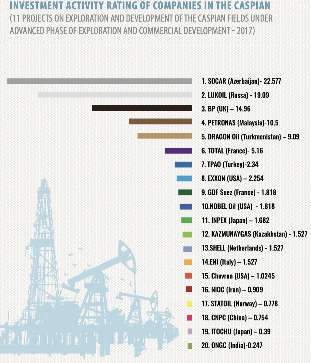 As it is seen from the rating, Azerbaijan National Company SOCAR firmly holds the first position in the investment activity rating both within its national sector of the Caspian Sea and across the entire Caspian space. It points to the importance of the Caspian fields for the economy of Azerbaijan, as well as to high geological certainty compared to sectors of other Caspian countries and the interest that foreign investors keep showing in upstream projects.