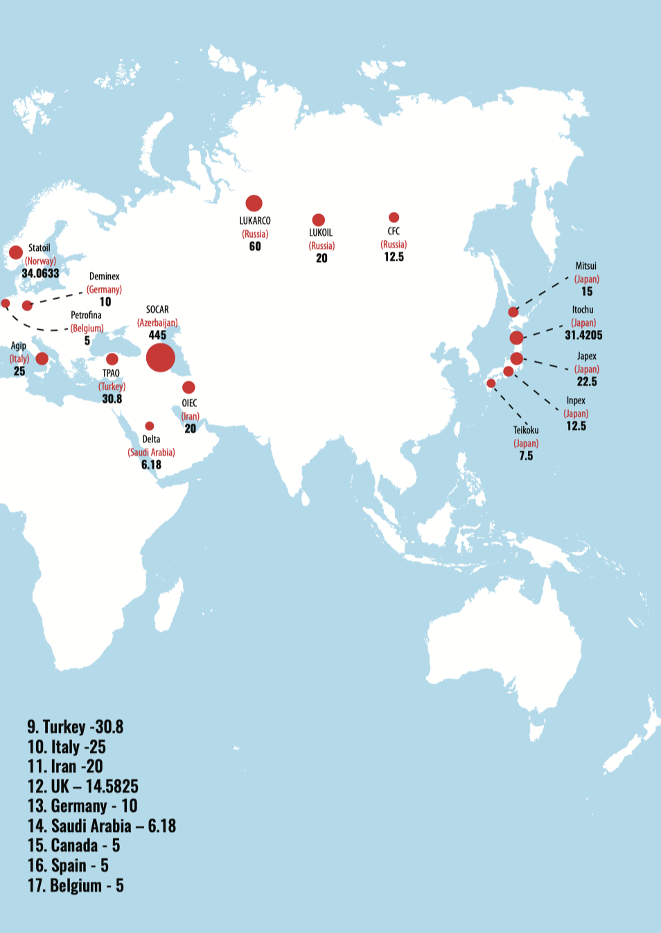 Russian holding LUKOIL, which occupied the second place in the rating, is carrying out broad activity in the Caspian mainly in the Russian sector, boosting oil production. Besides, the Russian company also owns a 10% stake in Shah Deniz development. Despite the creation of a number of joint ventures, noteworthy is the low level of cooperation between the companies of the Caspian states because every Caspian state sets the rate of upstream operations in accordance with the national priorities, export policy, tax and legal base, as well as the role of Caspian energy resources in GDP of Caspian states.