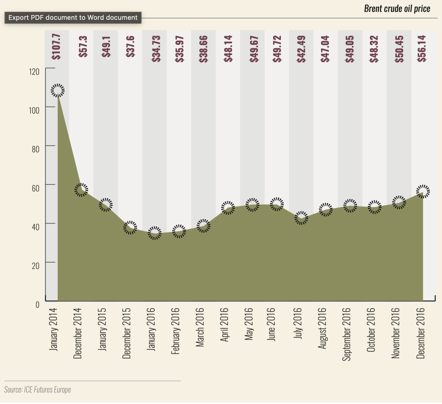 Brent crude oil price averaged $107.7 per barrel in January 2014 while this figure totalled $57.3 per barrel in December, $49.1 per barrel in January 2015, $37.6 per barrel in December 2015. Brent price fell down to $34.7 per barrel in 2016. The price totalled only $56.1 per barrel by December.