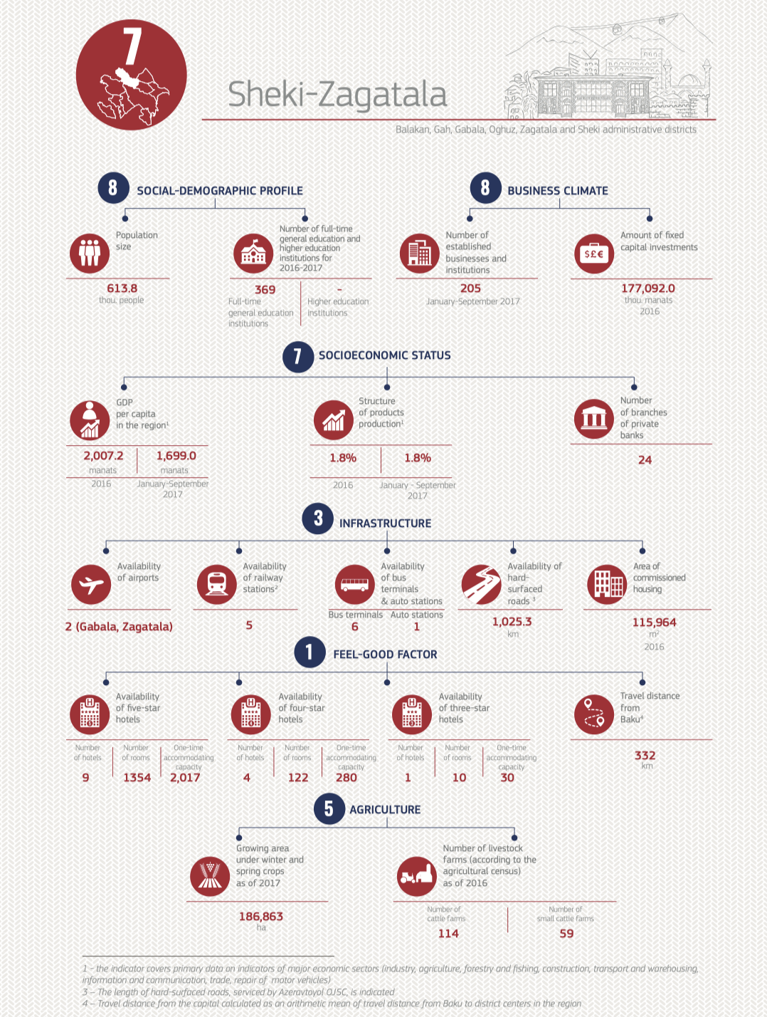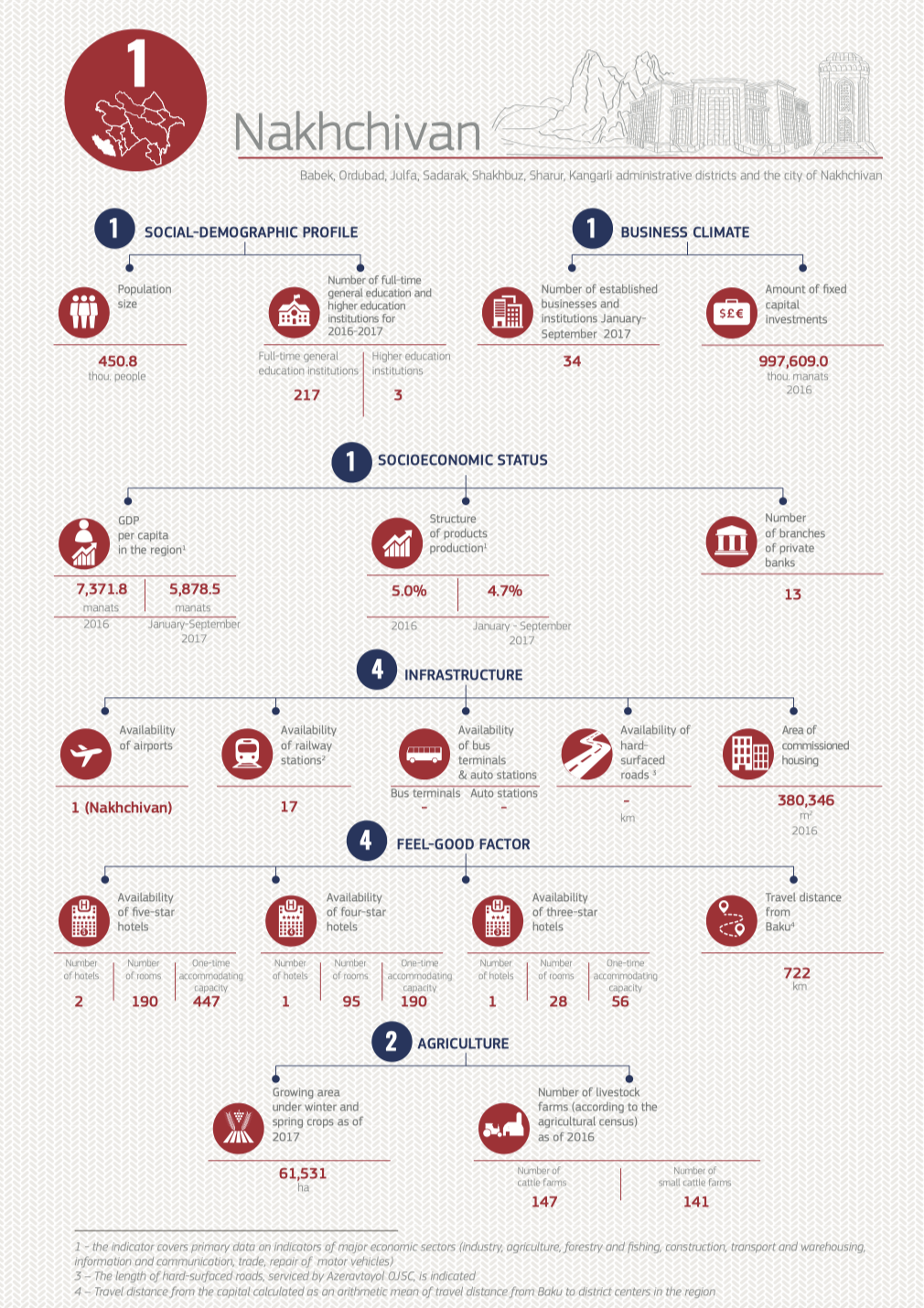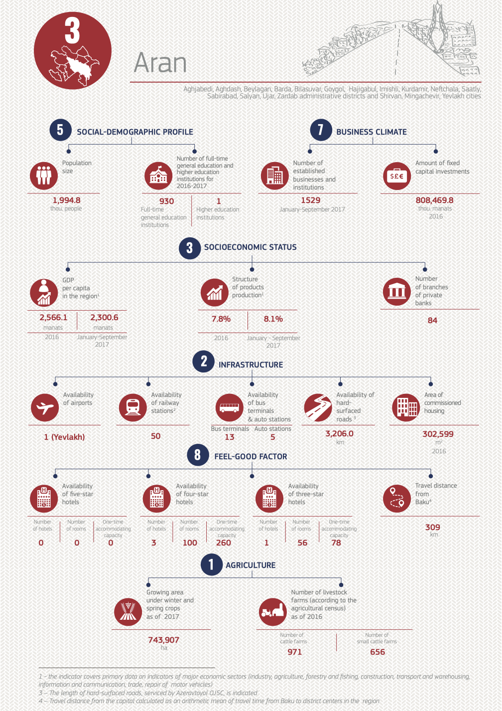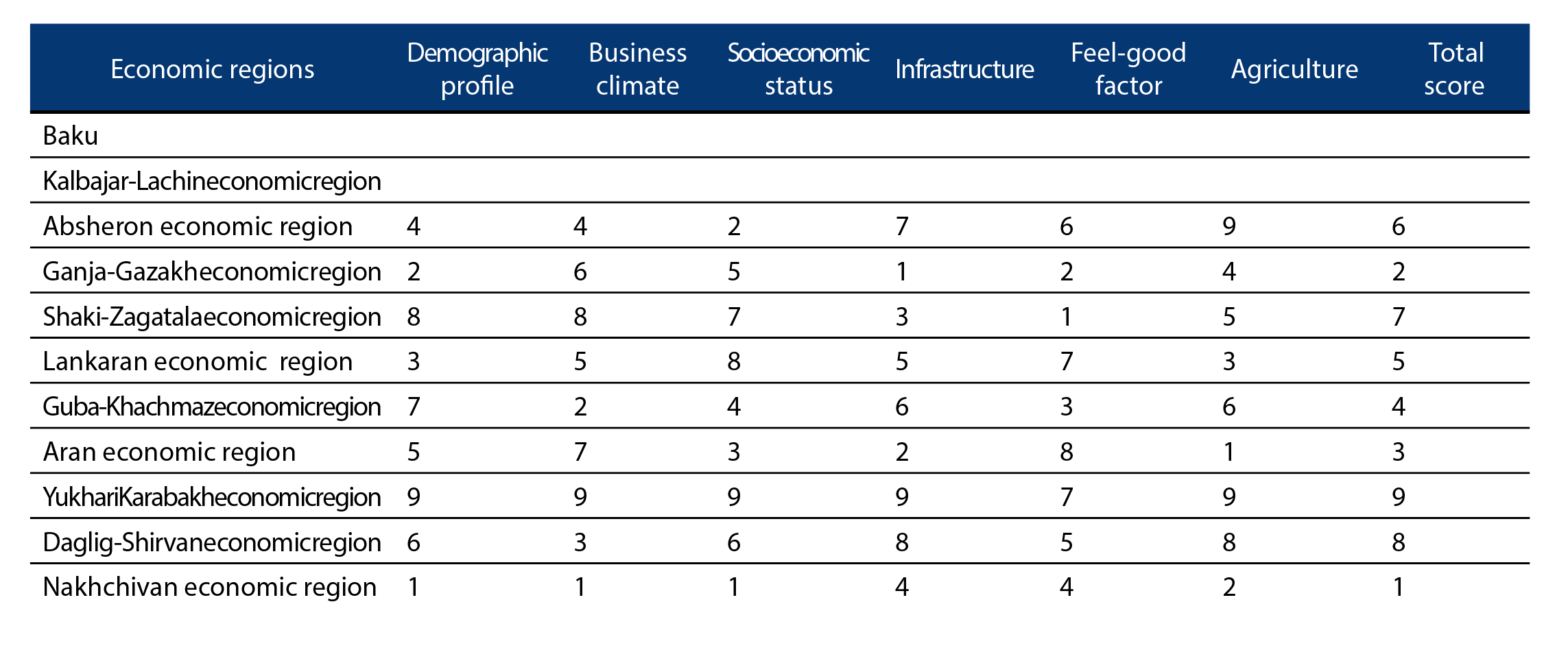 This year’s rating has assessed 11 economic regions of Azerbaijan (Absheron economic region, Ganja-Gazakh economic region, Sheki-Zagatala economic region, Lankaran economic region, Guba-Khachmaz economic region, Aran economic region, Yukhary Karabakh economic region, Kalbajar-Lachin economic region, Daghlyg Shirvan economic region, Nakhchivan economic region). The regions were ranked according to 18 parameters divided into 6 groups – social-demographic profile, socio-economic status, business climate, infrastructure, feel-good factor and agriculture. Ganja-Gazakh economic region, which got the highest total score, took the lead among the regions last year, while the leader of this year’s rating is Nakhchivan.