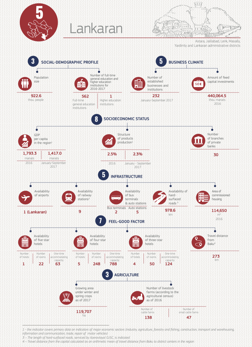 The distinctive feature of this rating is that we have put Baku into the rating, following the requests of the readers. Baku’s indicators serve as a relative benchmark and an indicator of development of the Azerbaijan regions. However, Baku did not join the final rating due to its dominant position.