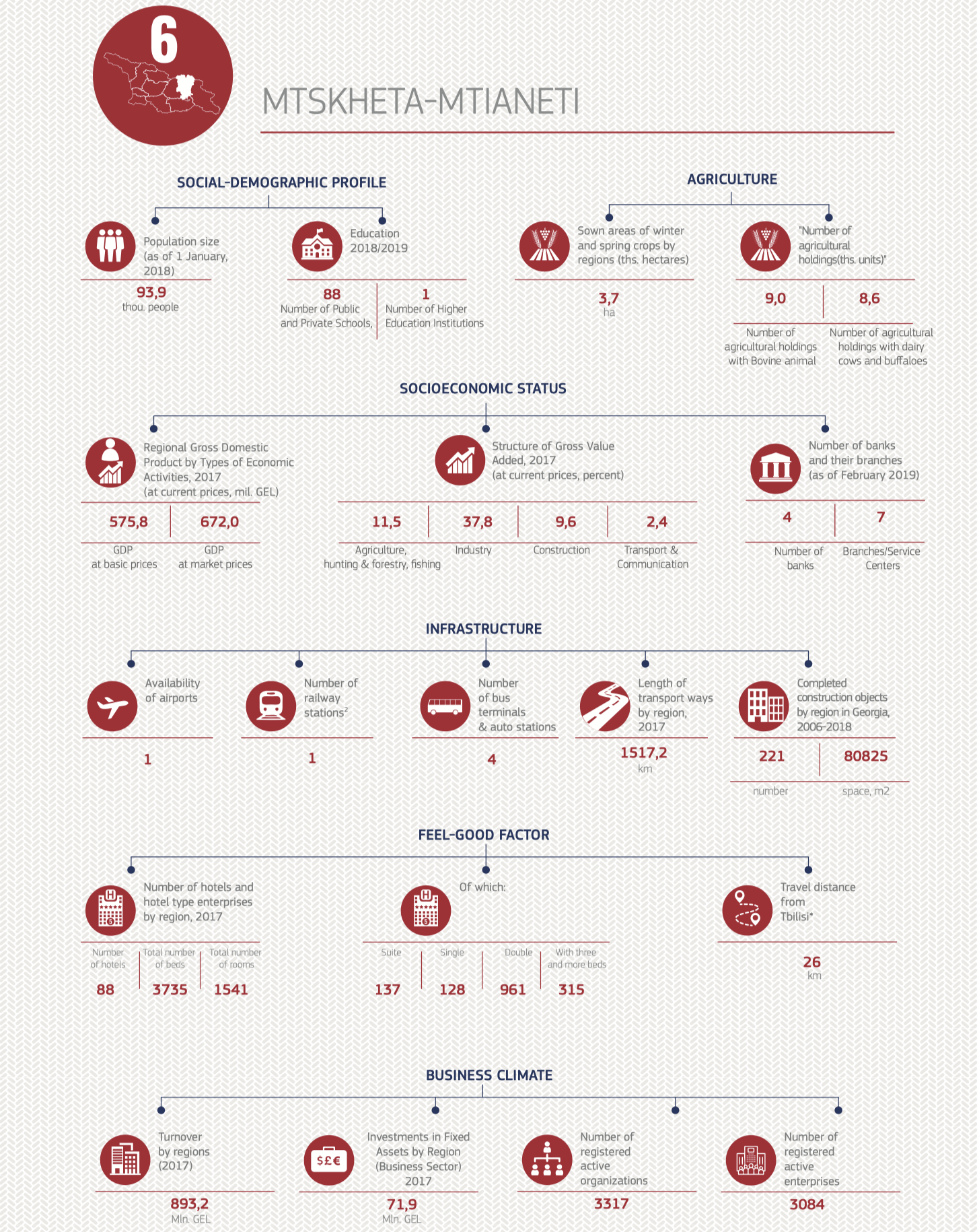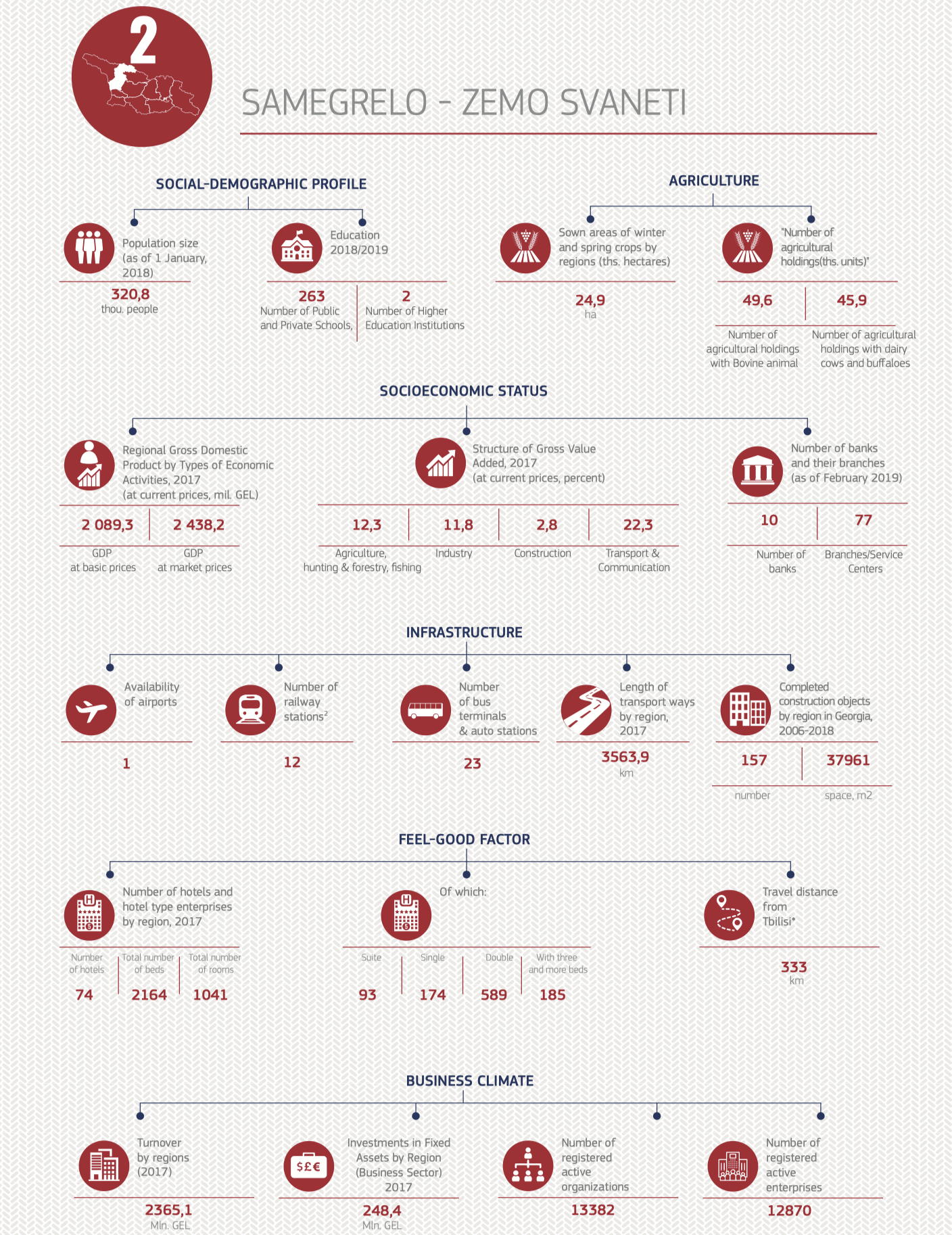The investment rating includes 12 economic regions of Georgia, among them are Tbilisi, the Autonomous Republic of Adjara, the Autonomous Republic of Abkhazia, Guria, Imereti, Kakheti, Mtskheta-Mtianeti, Racha-Lechkhumi and Kvemo Svaneti, Samegrelo-Zemo Svaneti, Samtskhe-Javakheti, Kvemo Kartli, Shida Kartli. The rating is ranked by 13 parameters divided into 6 groups: social-demographic characteristics, socioeconomic situation, business climate, infrastructure, comfort of hotel and tourism facilities and agriculture. Tbilisi came in top place among the regions which reached the highest total score. Imereti and Samegrelo – Zemo Svaneti have shared the second place.