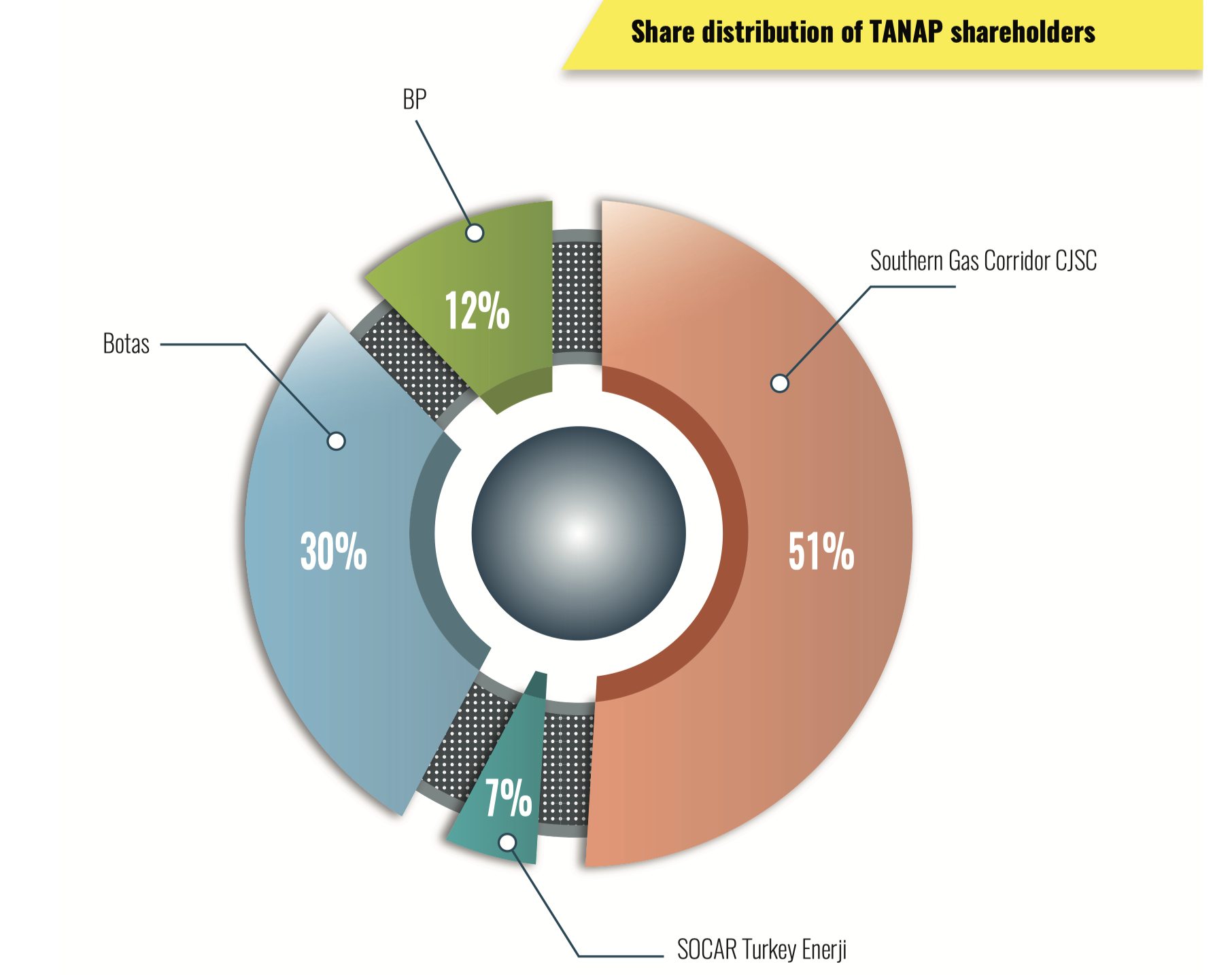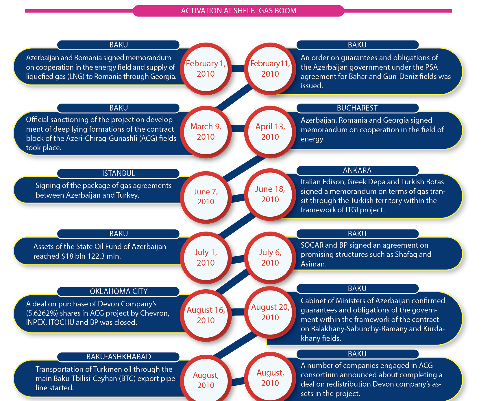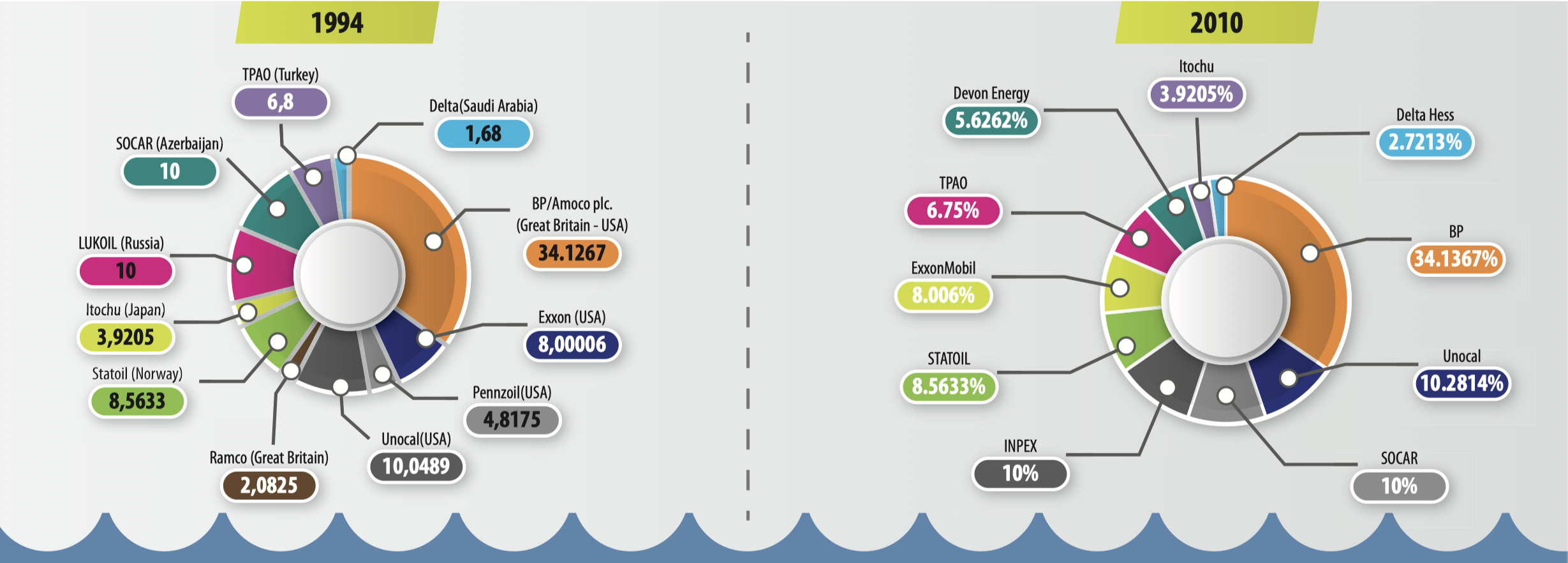 According to the new contract, the share of BP (project operator) will make 30.7%, SOCAR (25%), American companies Chevron (9.57%) and ExxonMobil (6.79%), Indian ONGC (2.31%), Japanese Corp. (9.31%) and ITOCHU Oil (3.65%), Norwegian Statoil (7.27%), Turkish TPAO (5.73%).