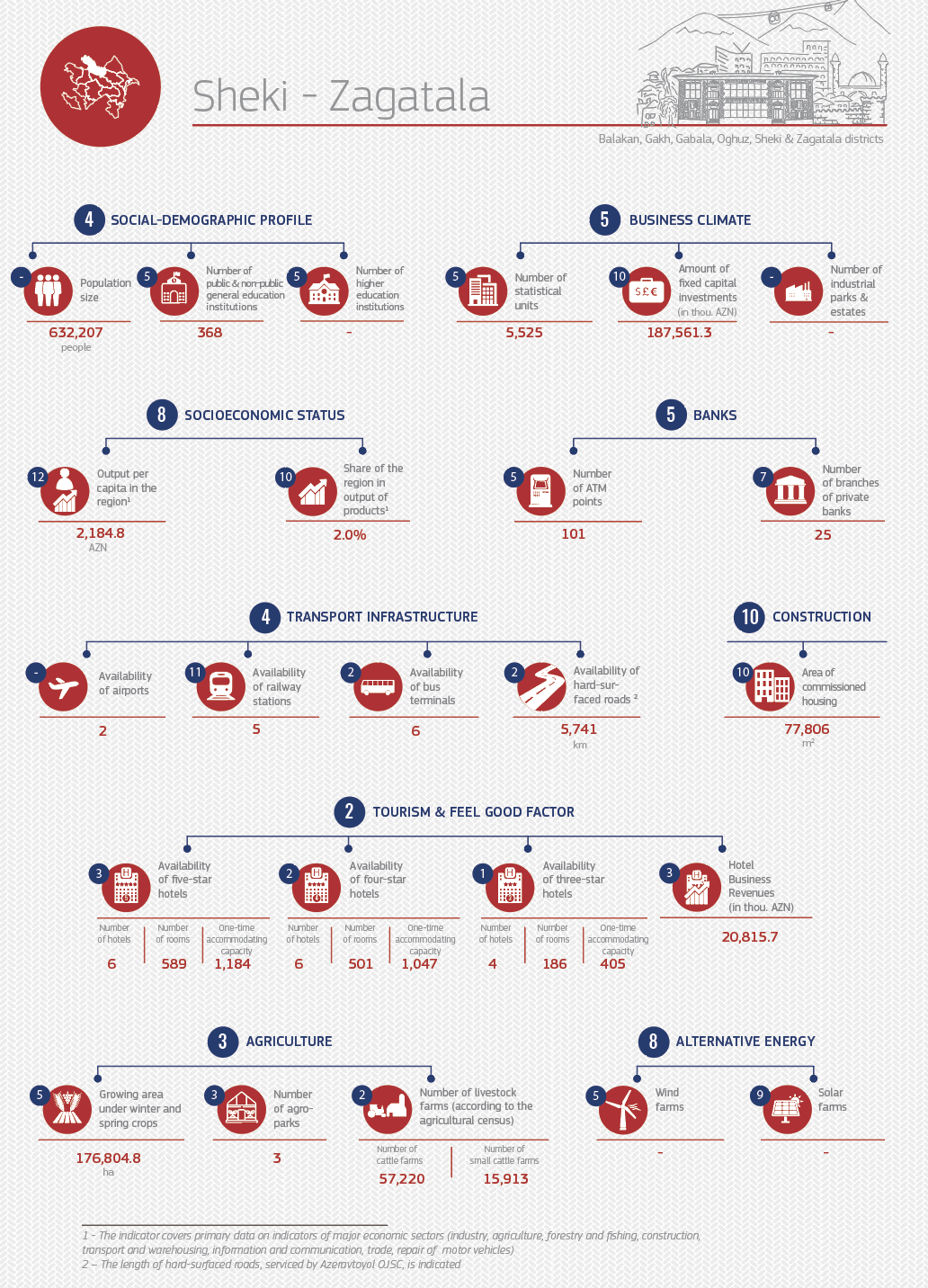 Infrastructure development indicators are closely linked with the number of airports. There is a total of 7 airports in Azerbaijan. The largest one is in Baku and two more in Sheki-Zagatala. Absheron-Khizi has the longest railway track consisting of 27 stations, followed by Nakhchivan with 17 stations. Apart from Baku (6,133km), there is a large length of hard-surfaced roads in Sheki-Zagatala (5,741km) and Guba-Khachmaz (5,738km). Lankaran-Astara (5,216km) is coming fourth.