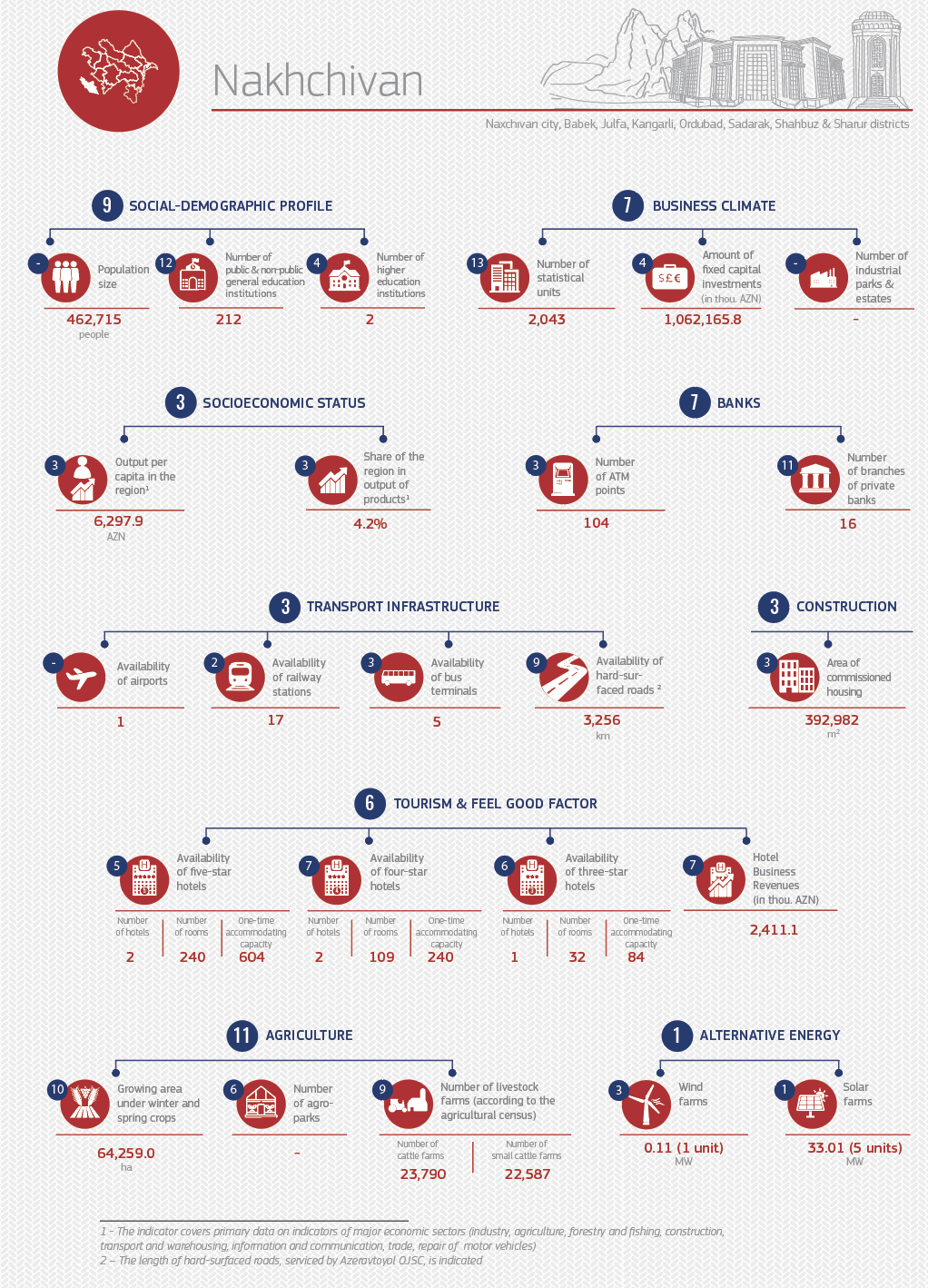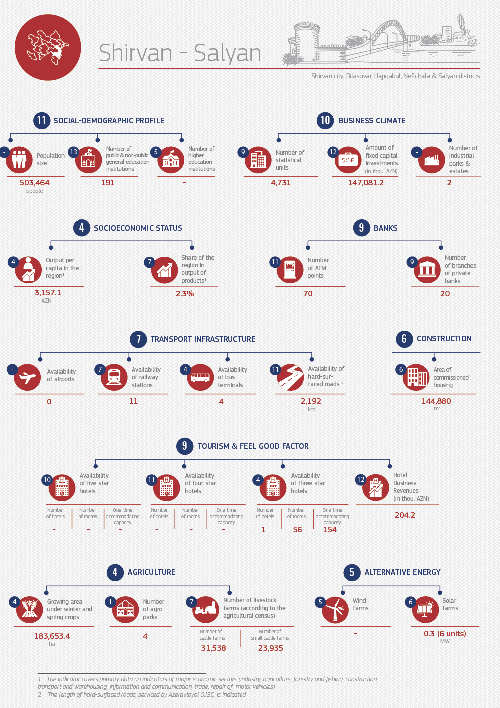 The most favorable socioeconomic status indicators in all terms are seen in Baku. Among the economic regions Absheron-Khizi (6,866.9 AZN per capita, this is not the most densely populated region taking the 8th position on this indicator) accounts for the highest volume of total output per capita. Then comes Nakhchivan (6,297.9 AZN, the twelfth most populous region) on the third place after Baku (19,954.1 AZN), Shirvan-Salyan is the fourth (3,157.1 AZN) by a significant margin, and the lowest figure has been registered in East Zangazur (1,174.5 AZN) coming on the 14th place - this is almost 15 times lower than the figure of Baku and several times less than that of Nakhchivan. The total output of products per capita in the Absheron-Khizi and Nakhchivan regions, prevailing in terms of the population size, is three times lower than in Baku.