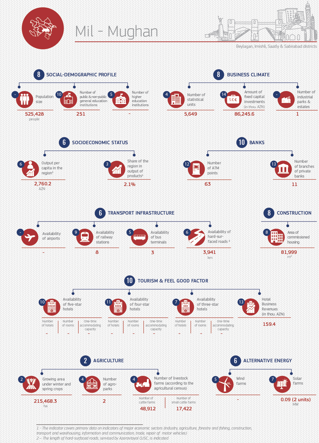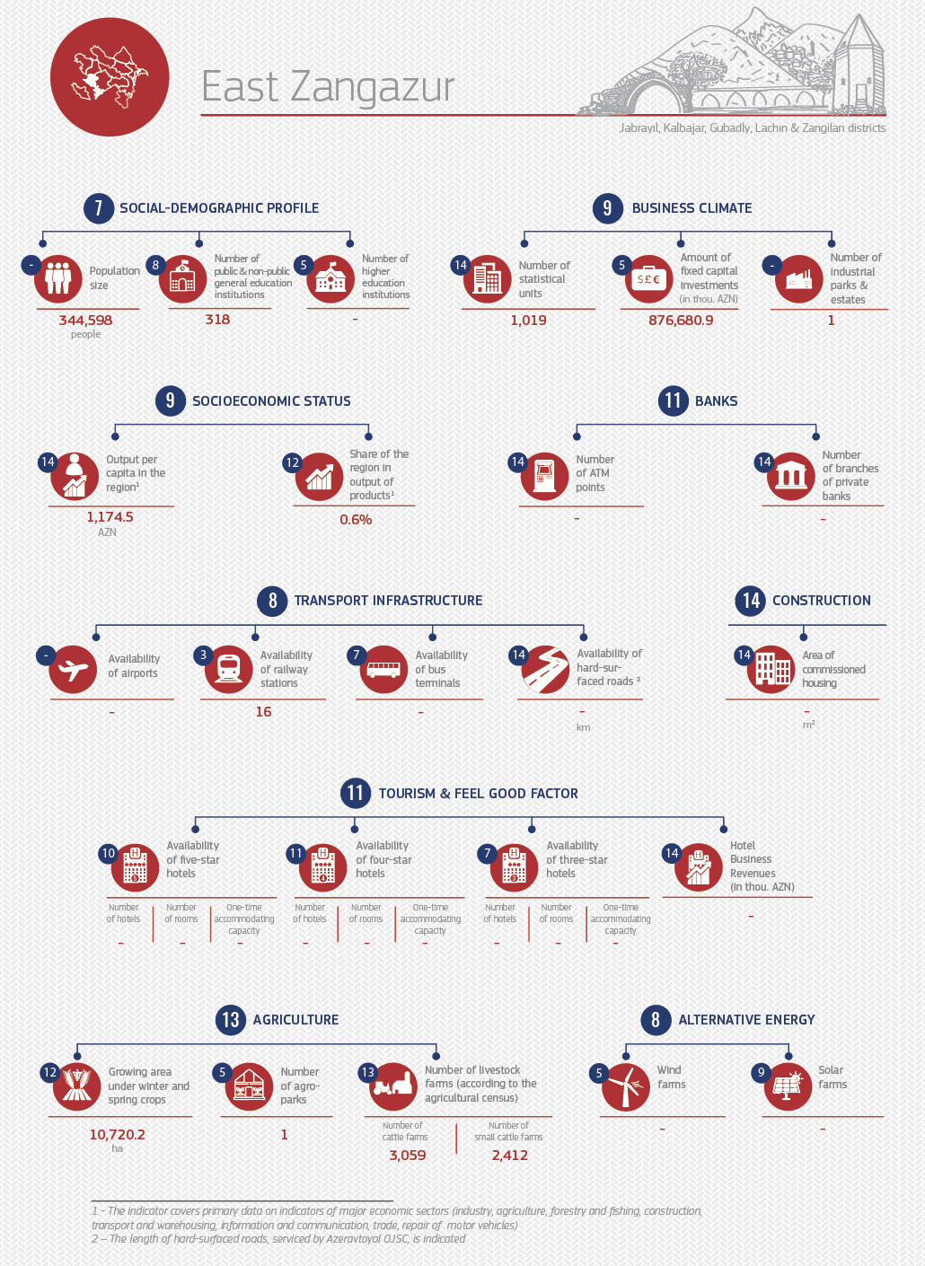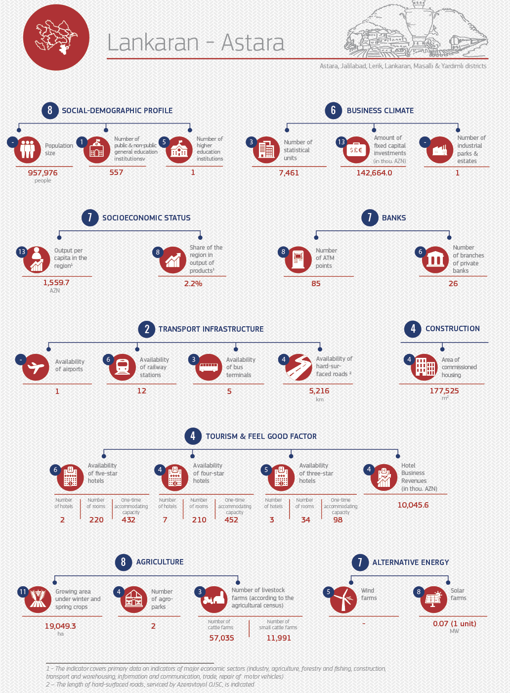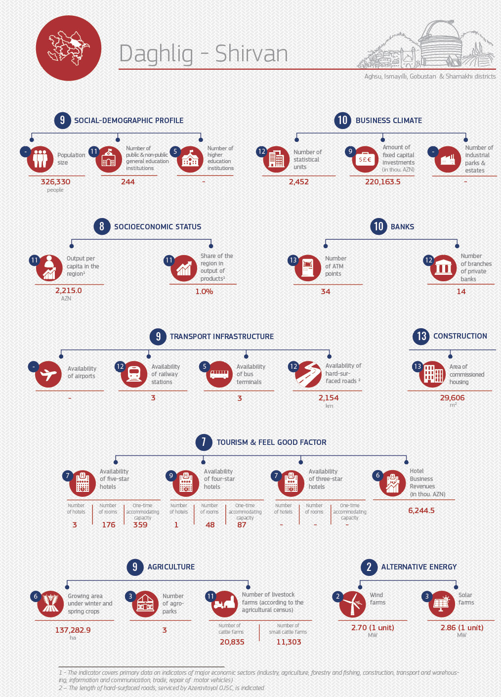 According to the final results of the 14-point assessment, Guba-Khachmaz and Central Aran regions share the second place after Baku. Coming next on the third position by a small margin is Absheron-Khizi, Ganja – Dashkasan comes fourth, the fifth place is taken by Sheki-Zagatala, the sixth by Nakhchivan, seventh - Lenkaran-Astara, eighth - Garabagh, ninth - Gazakh-Tovuz and Mill-Mugan, the tenth place is taken by Shirvan Salyan, the eleventh by Daghlig Shirvan, and the twelfth by East Zangazur.