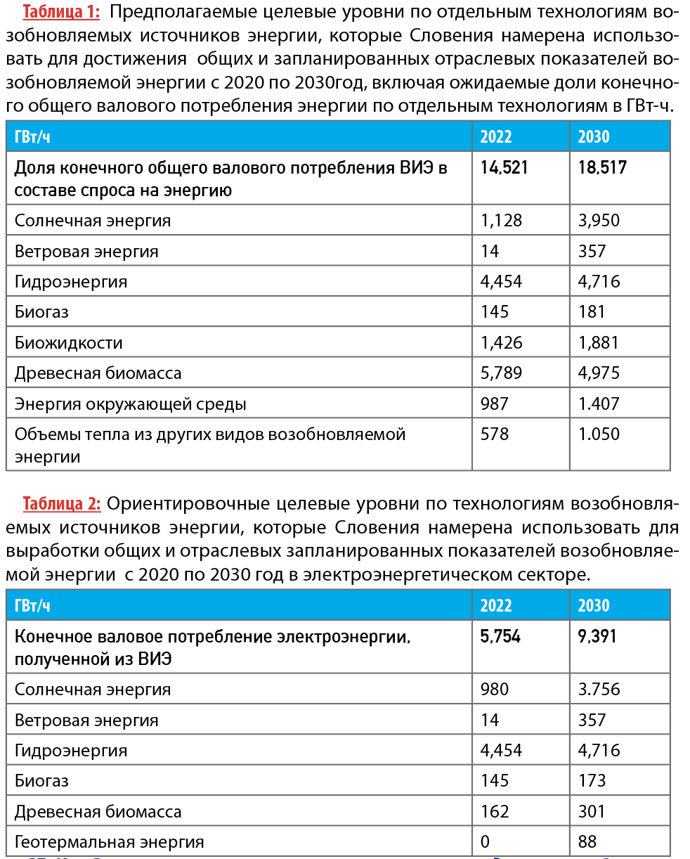 За последние несколько лет Словении удалось продвинуться в сфере производства солнечной энергии, хотя показатели выработки все еще относительно невелики. В 2021 году доля солнечной энергии в общем объеме выработки электроэнергии в Словении составила 3,5%. Текущий проект обновленного национального энергетического и климатического плана включает в себя следующие запланированные мероприятия по ВИЭ. В нижеприведенных таблицах представлены показатели по долям различных видов возобновляемых источников энергии.