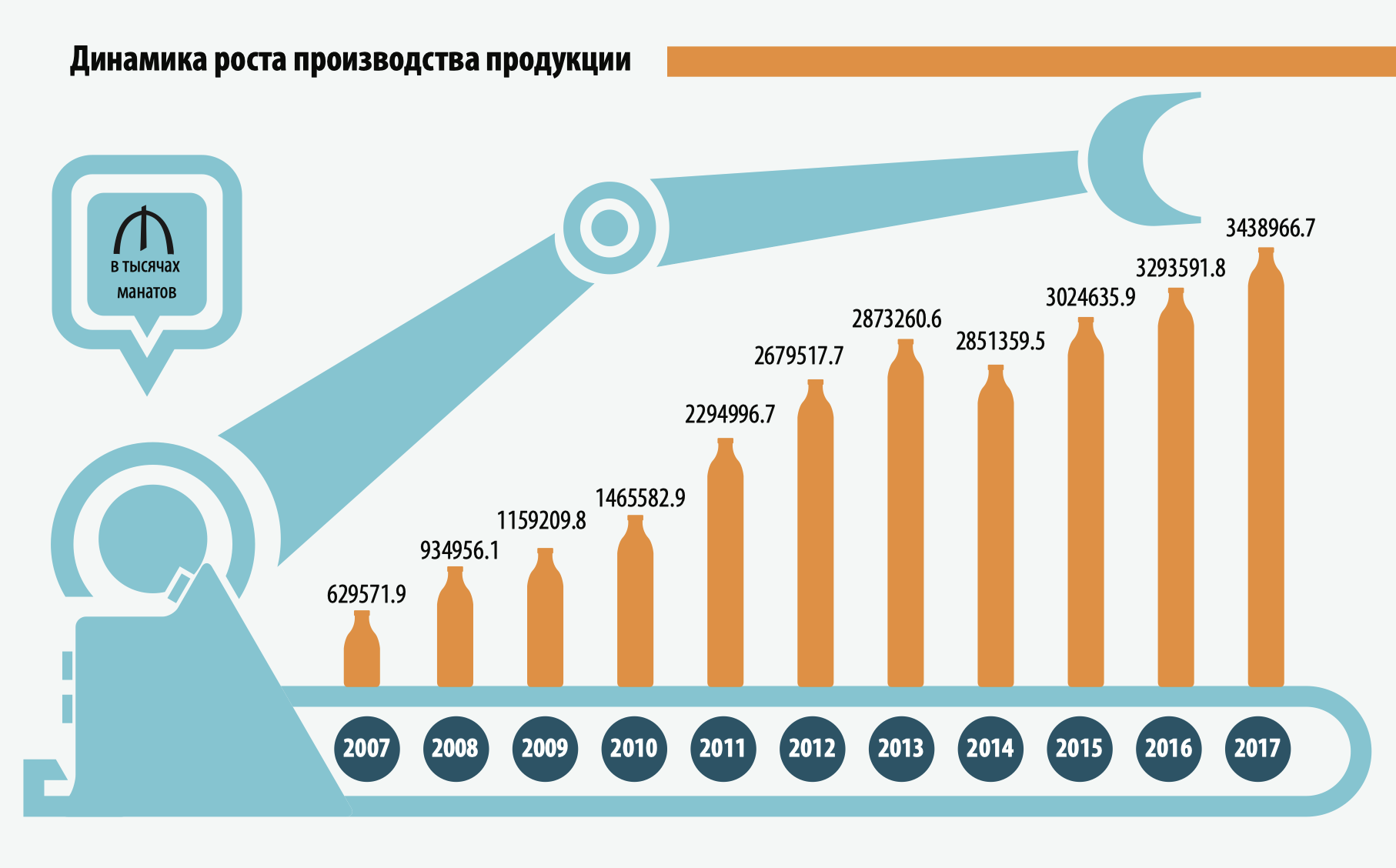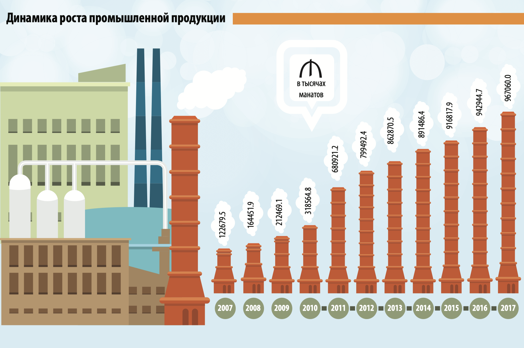 Реформы, проведенные в области промышленности, оказали положительное влияние на рост производства продукции. В 2017-ом году был зарегистрирован объем производства промышленной продукции, превышающий 967 миллионов манатов. За последние 10 лет доля негосударственного сектора в производстве промышленной продукции увеличилась с 69 процентов до 95 процентов.