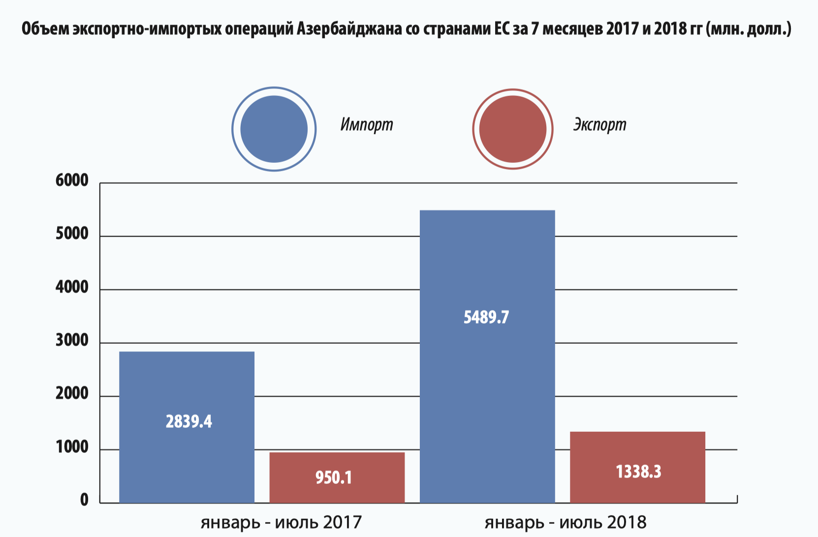 За минувшие семь месяцев 2018 года, по данным Госкомтаможни АР, товарооборот между странами ЕС и Азербайджаном достиг почти семь миллиардов долларов. При этом экспорт в ЕС по сравнению с показателем аналогичного периода прошлого года вырос почти в 2 раза, составив 5,5 миллиарда долларов, а импорт - на 41 процент, до 1,3 миллиарда долларов.