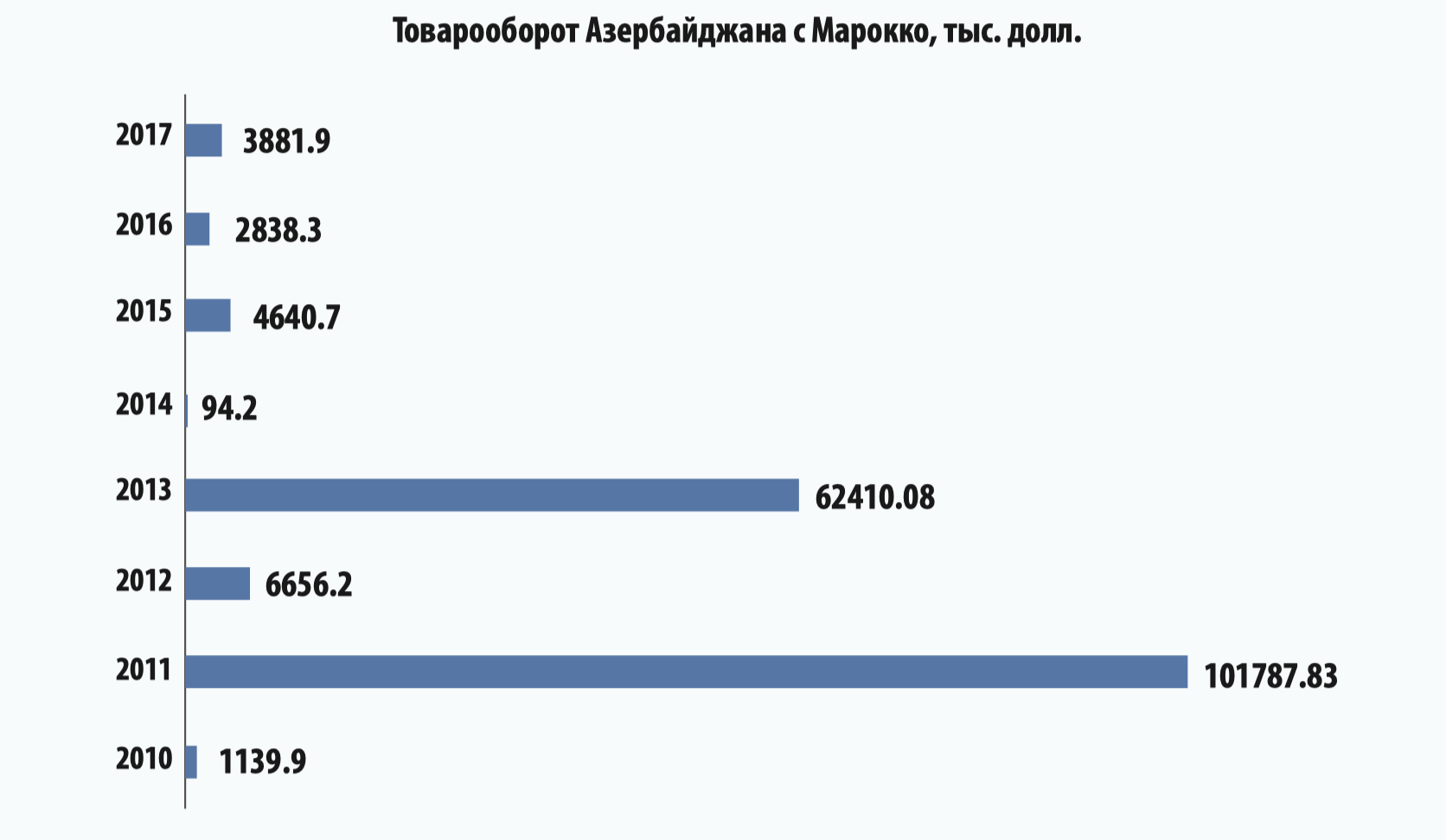 Увеличить товарооборот с Азербайджаном планирует также Марокко. По данным Государственного таможенного комитета Азербайджана, товарооборот с Марокко по итогам 2017 года составил примерно 3,9 миллиона долларов. Несмотря на это, два правительства работают для развития экономического партнерства и обеспечения роста товарооборота. Имеется много возможностей для марокканских и азербайджанских бизнесменов в двух странах. Подписание соглашений как на двустороннем уровне, так и на уровне совместного двустороннего комитета обеспечит бизнес сообщество правовой базой для развития экономических отношений.