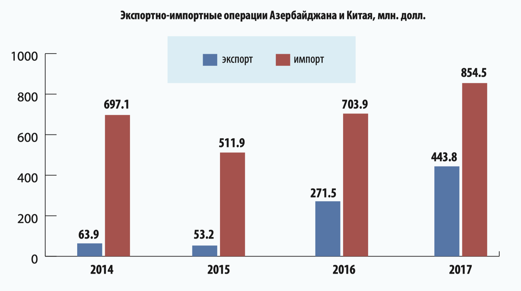 В 2017 году товарооборот между Азербайджаном и Китаем составил 1 298 миллионов долларов. Объем товарооборота в прошлом году вырос на 33,16 процента и достиг высшего исторического уровня. Экспорт из Азербайджана в Китай за отчетный период вырос на 63,75 процента и составил 443,8 миллиона долларов, импорт из Китая в Азербайджан увеличился на 21,38 процента и составил 854,5 миллиона долларов. Таким образом, Китай стал четвертым по величине торговым партнером Азербайджана в 2017 году.