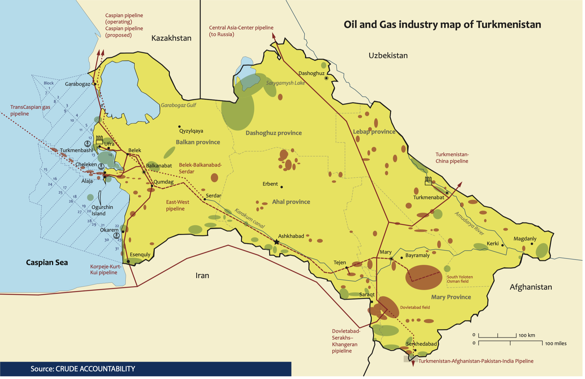 Turkmenistan’s largest fields are concentrated in the Mary province, east of the country. The overall reserves of Galkinish with surrounding fields were estimated by local geologists and British GCA at a range of 26.2 trl cubic meters.