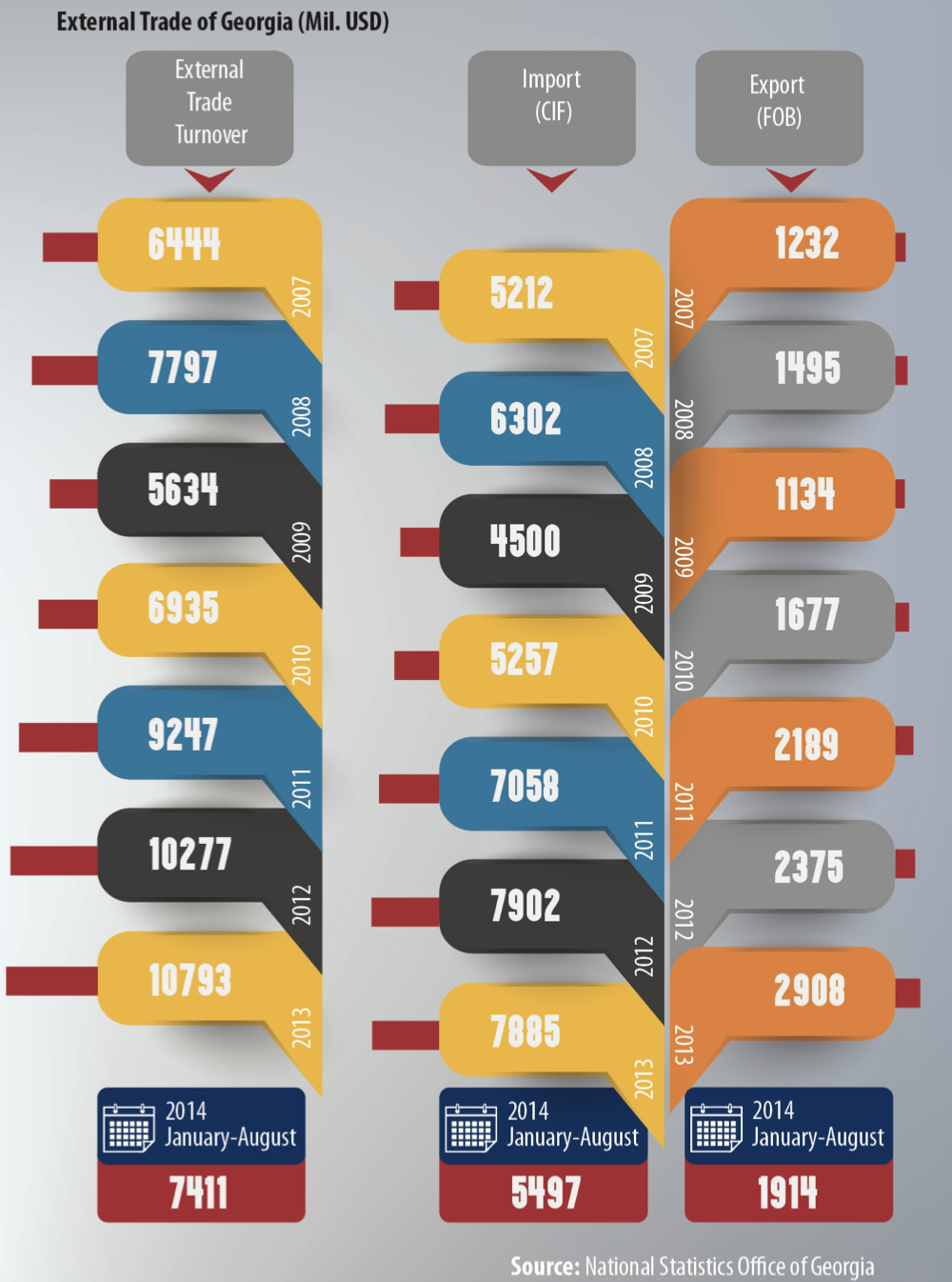 After joining the WTO Georgia’s gross domestic product in current prices increased by 350% and estimated 27 billion GEL up from 6 billion GEL. Foreign trade grew almost 11 times, from 1billion to 11 billion USD. Further, exports rose 800% and imports increased by 1000%.
