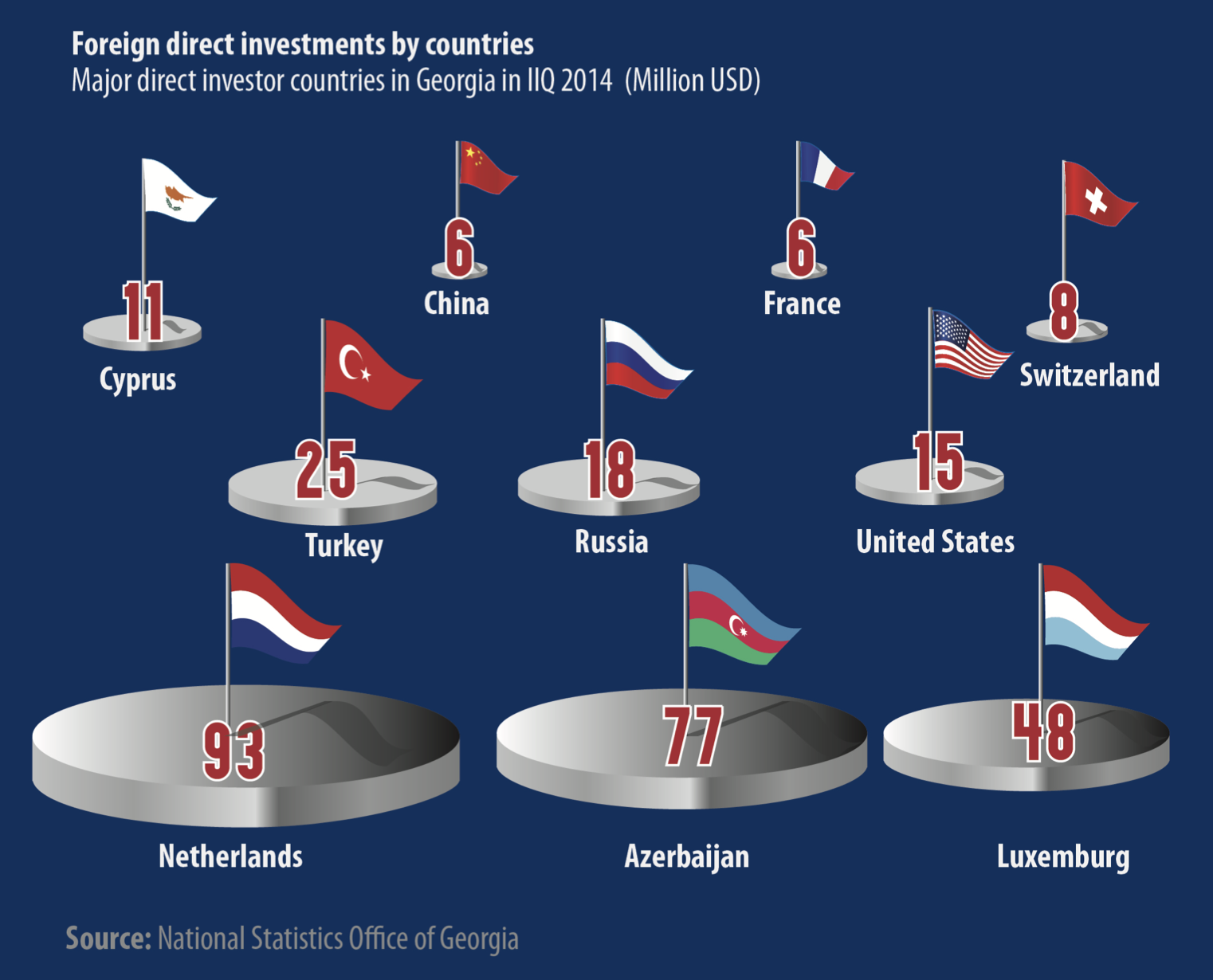 In term of investments into the economy of Georgia in IIQ 2014, Netherlands take the lead with $93 million, which makes 62% of the total amount of direct foreign investments. It is followed by Azerbaijan with $77 million (51%) and Luxemburg with $48 million (32%).