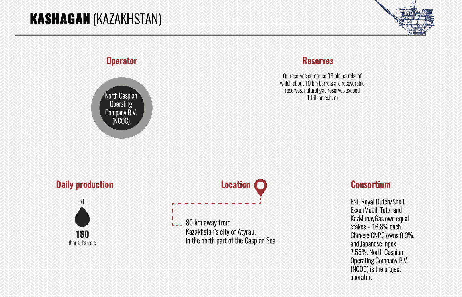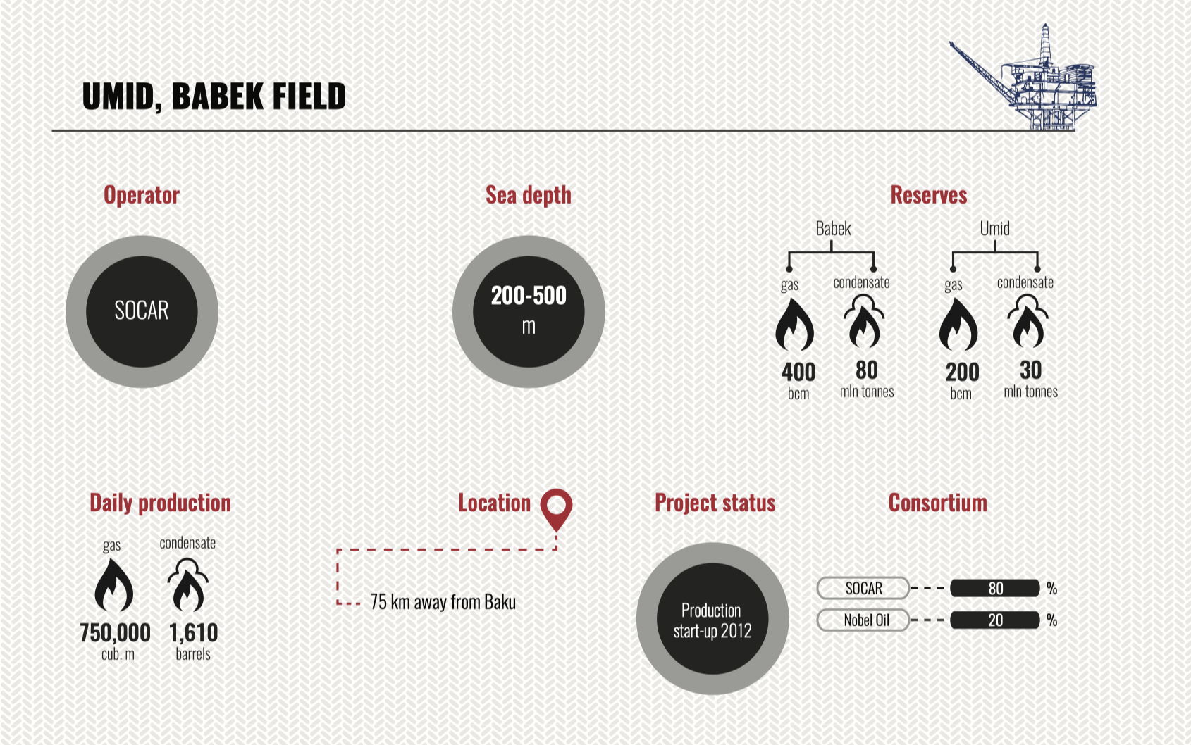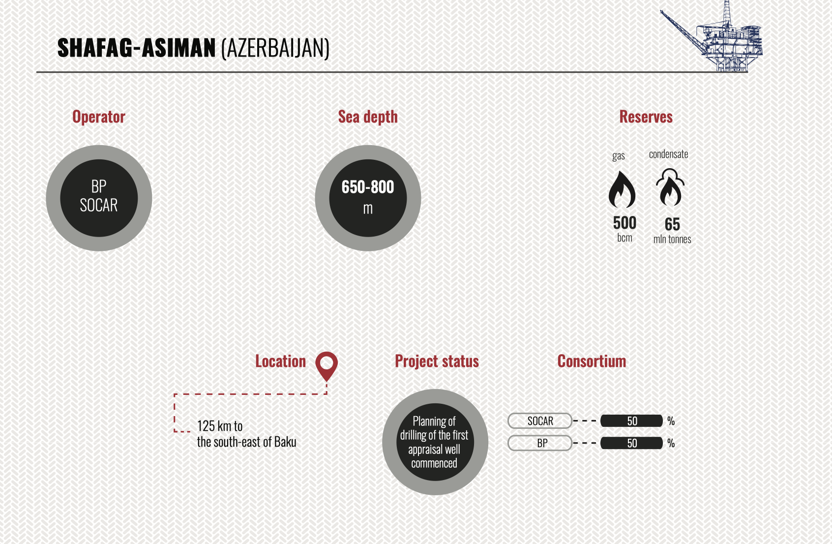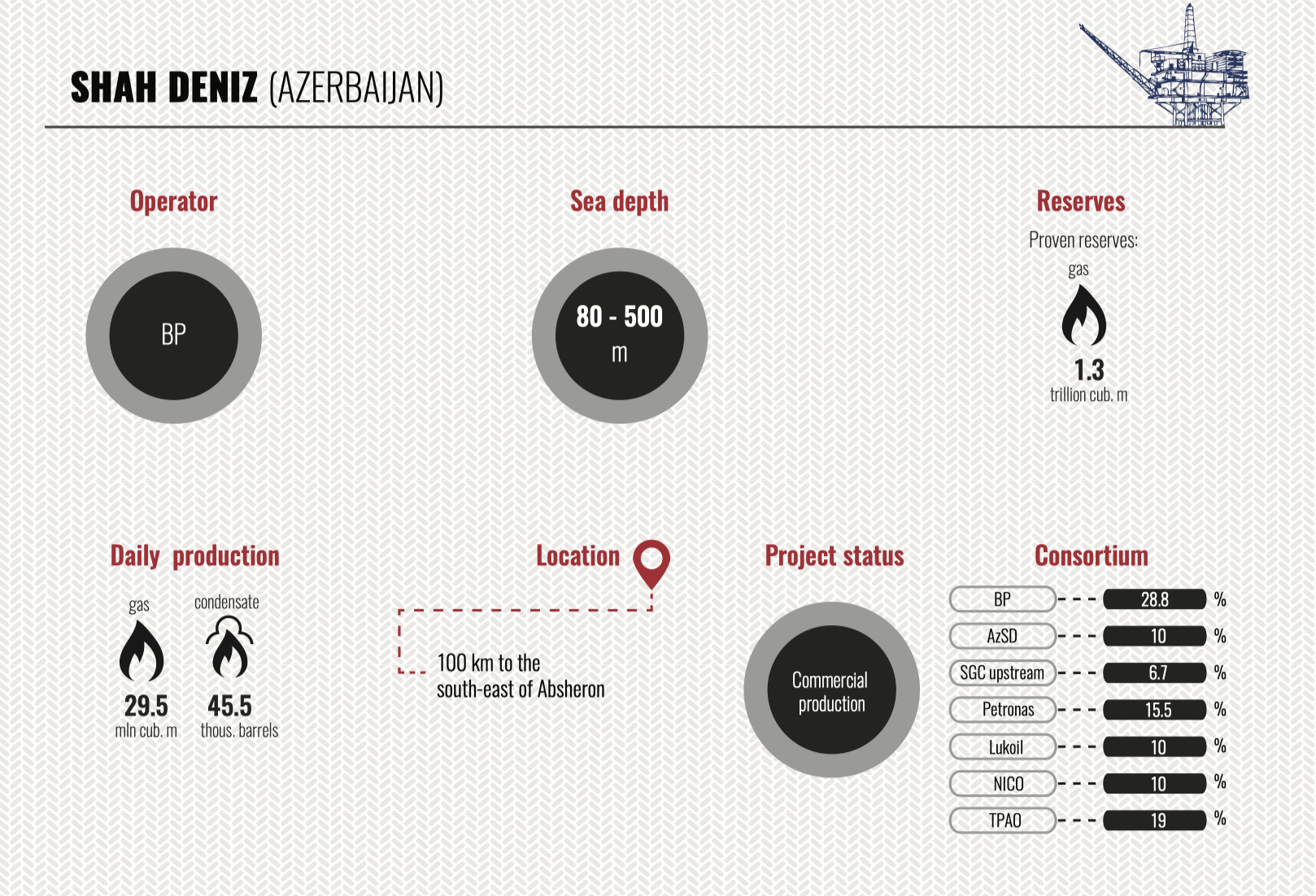 Compiling the investment rating of companies performing oil-gas operations in the Caspian fields, we have split the rating into three parts in order to provide a complete picture of the present pattern of investing in oil-gas operations in the Caspian, a high potential of Caspian fields and promising areas in current hard market conditions. The first part covers old Caspian fields(some of them have been under development for 100 (!) years, there is no analogue for it in the world now), the second one covers relatively new investment projects in Azerbaijan and on the Caspian in general, where production is already running. And the third part includes fields discovered by foreign consortiums in the Azeri sector late in the 20th century and projects on them were closed just because the result of exploration and further appraisal revealed mainly gas bearing deposits which used to be considered commercially unfavourable at that period.