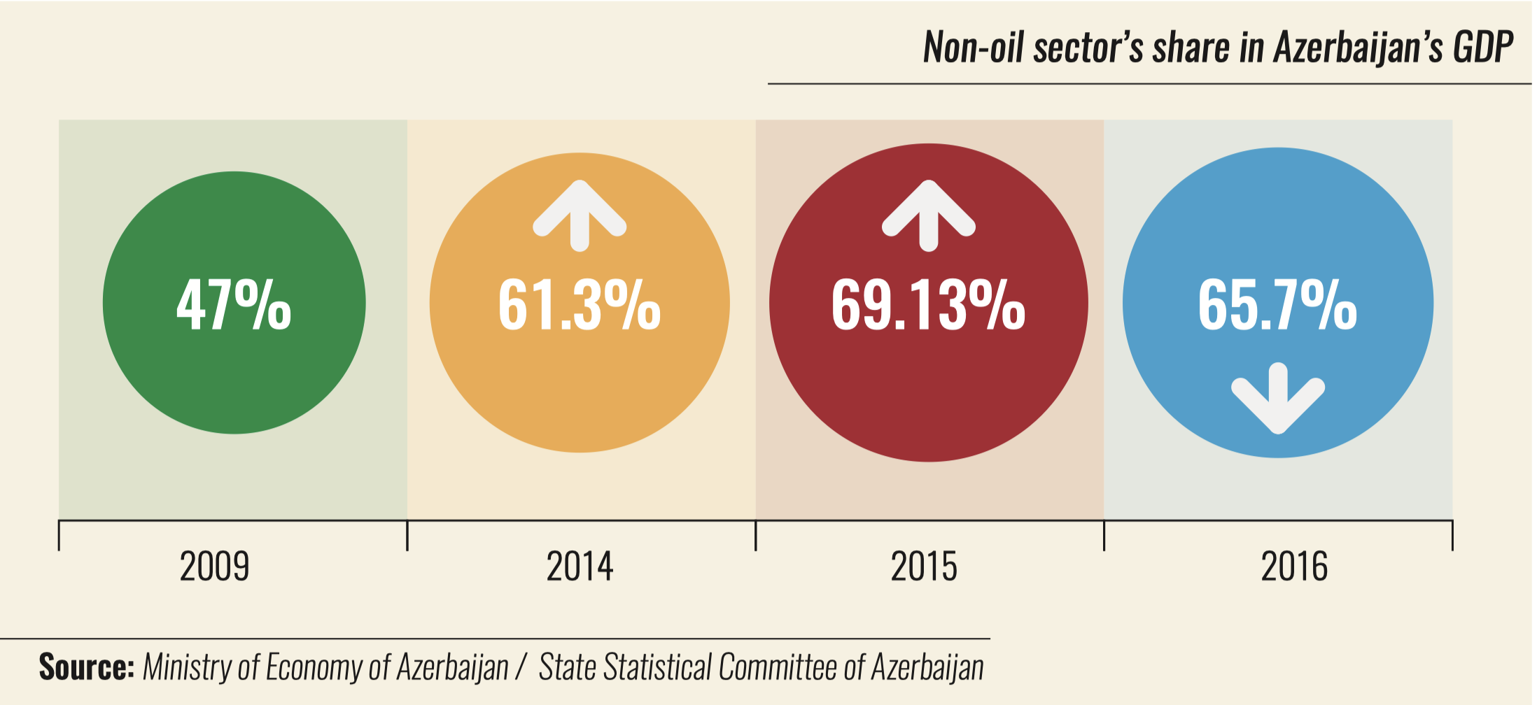 Azerbaijan has felt the bite of the unparalleled crisis of the world oil market prices that has been lasting for more than 2 years. Despite the non-oil sector’s share in GDP is growing year by year the revenues of the state budget are still firmly tied up to the oil export. Non-oil sector’s GDP totalled 47% in 2009 while this figure made 61.3% in 2014 and 69.3% in 2015. According to the data of the Ministry of Economy, it is mainly the non-oil sector which has contributed to the GDP growth in recent years. The non-oil sector is also ahead in terms of the rate of attracting investments. Investments worth $20bln flew into the Azerbaijani economy in 2015, the share of the non-oil sector comprised $10.2bln.