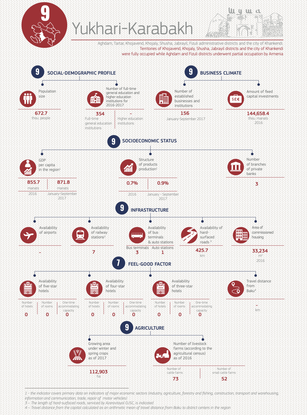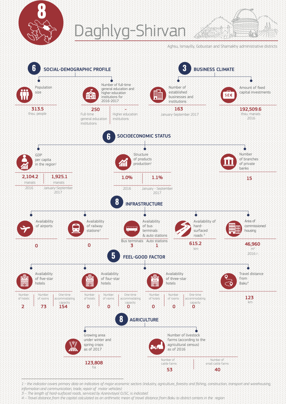 This year’s rating has assessed 11 economic regions of Azerbaijan (Absheron economic region, Ganja-Gazakh economic region, Sheki-Zagatala economic region, Lankaran economic region, Guba-Khachmaz economic region, Aran economic region, Yukhary Karabakh economic region, Kalbajar-Lachin economic region, Daghlyg Shirvan economic region, Nakhchivan economic region). The regions were ranked according to 18 parameters divided into 6 groups – social-demographic profile, socio-economic status, business climate, infrastructure, feel-good factor and agriculture. Ganja-Gazakh economic region, which got the highest total score, took the lead among the regions last year, while the leader of this year’s rating is Nakhchivan.