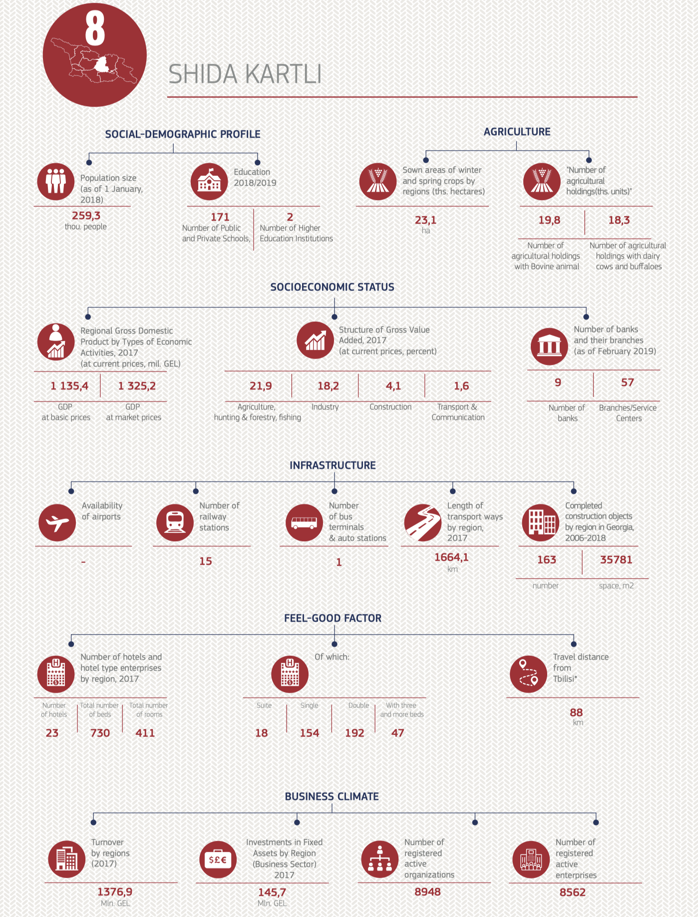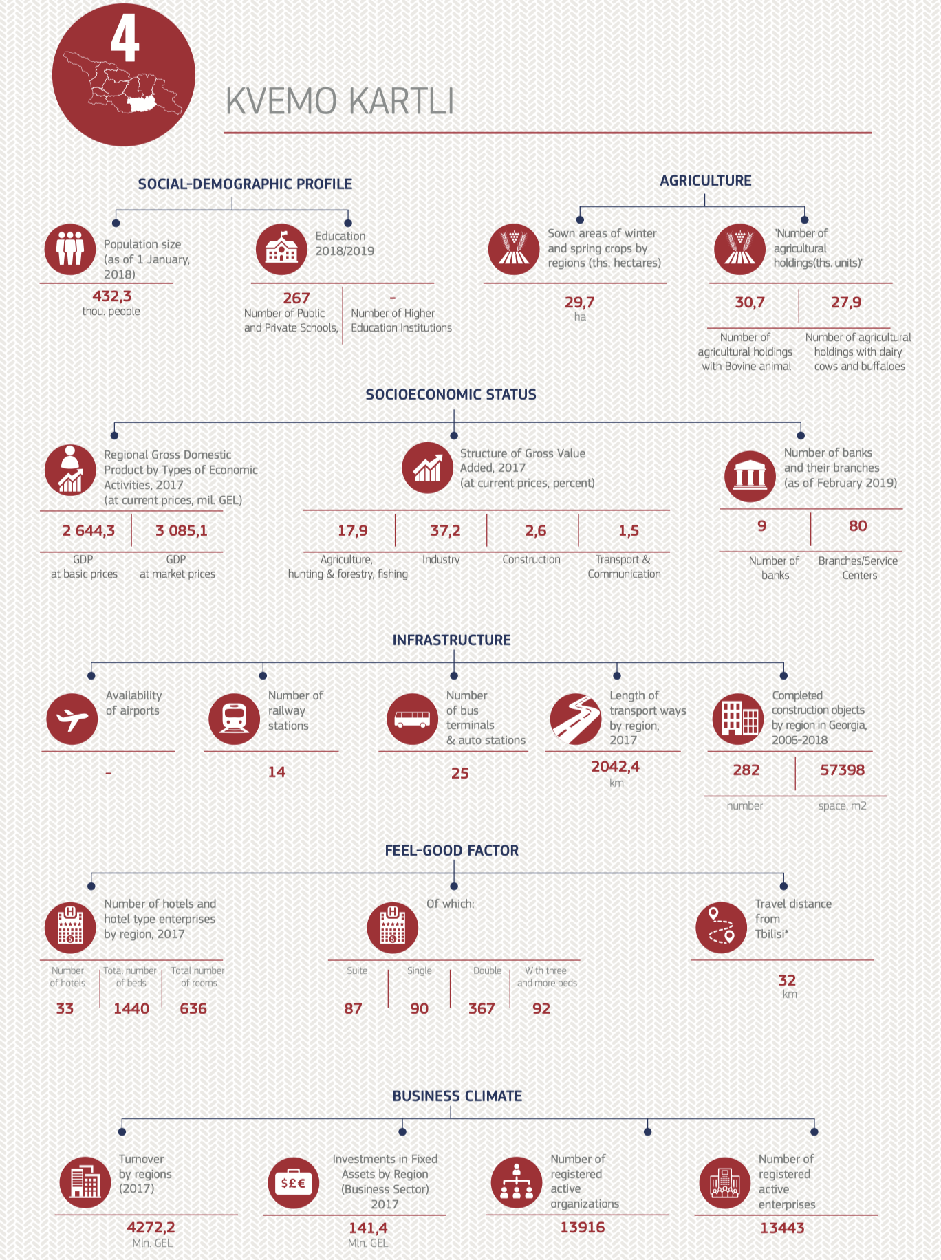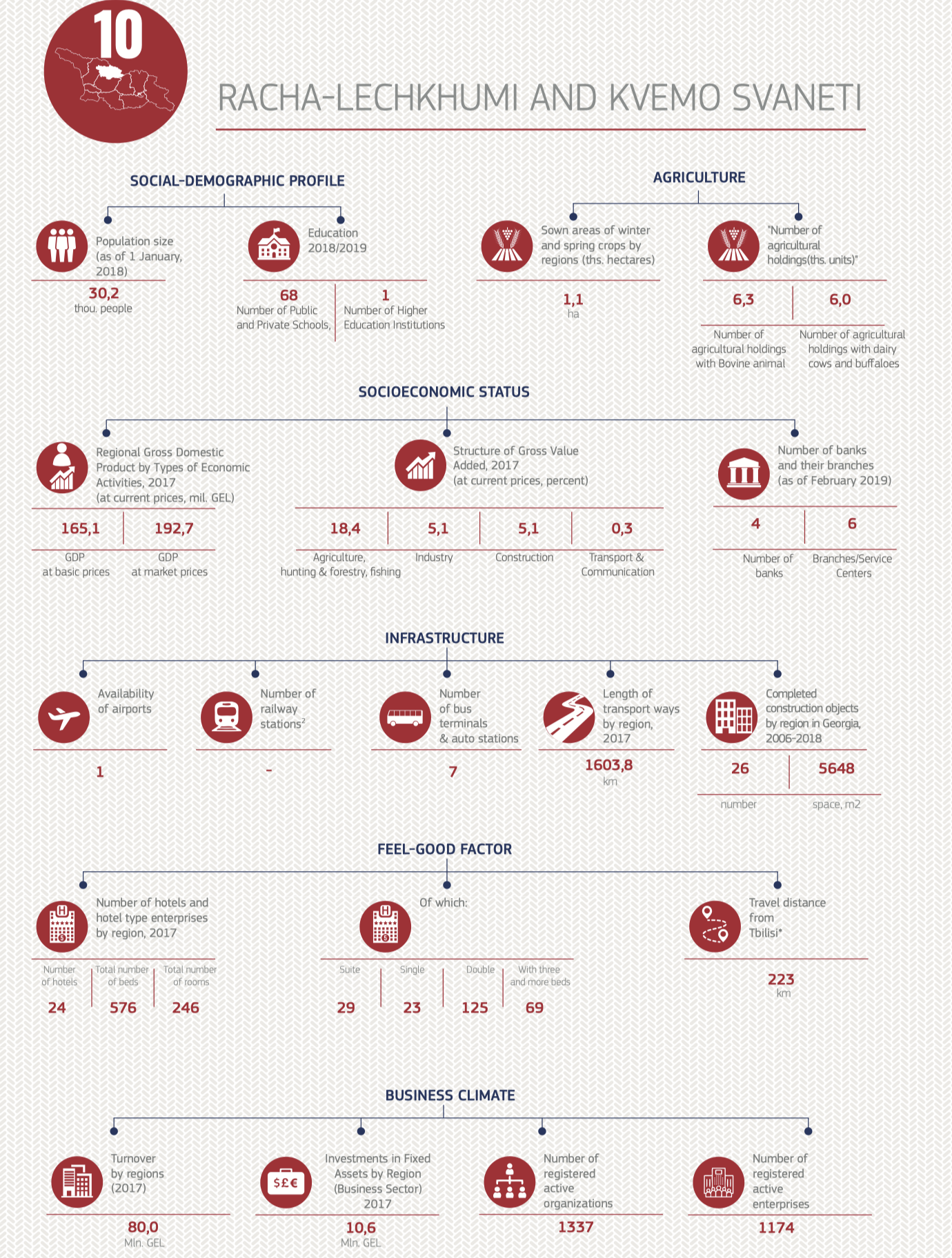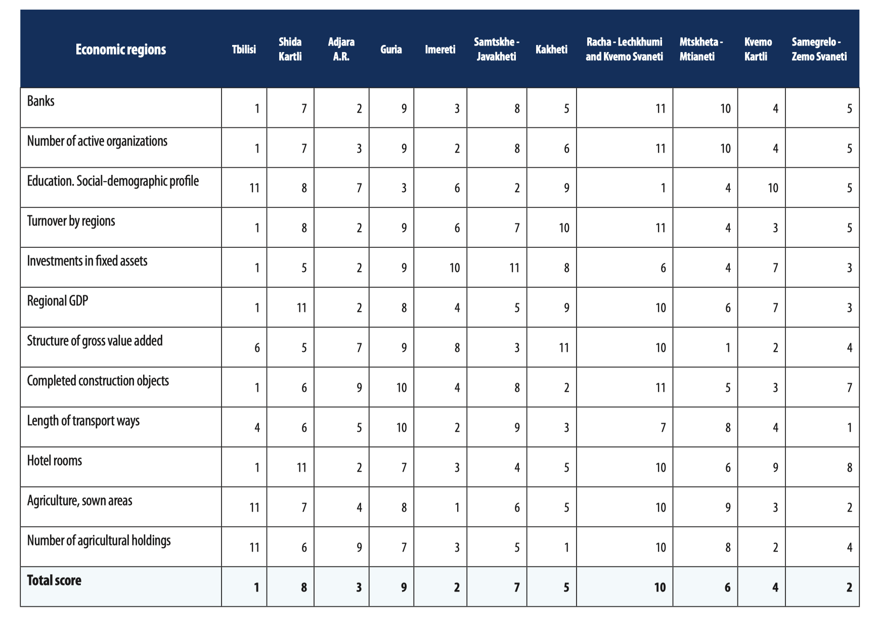 The investment rating includes 12 economic regions of Georgia, among them are Tbilisi, the Autonomous Republic of Adjara, the Autonomous Republic of Abkhazia, Guria, Imereti, Kakheti, Mtskheta-Mtianeti, Racha-Lechkhumi and Kvemo Svaneti, Samegrelo-Zemo Svaneti, Samtskhe-Javakheti, Kvemo Kartli, Shida Kartli. The rating is ranked by 13 parameters divided into 6 groups: social-demographic characteristics, socioeconomic situation, business climate, infrastructure, comfort of hotel and tourism facilities and agriculture. Tbilisi came in top place among the regions which reached the highest total score. Imereti and Samegrelo – Zemo Svaneti have shared the second place.