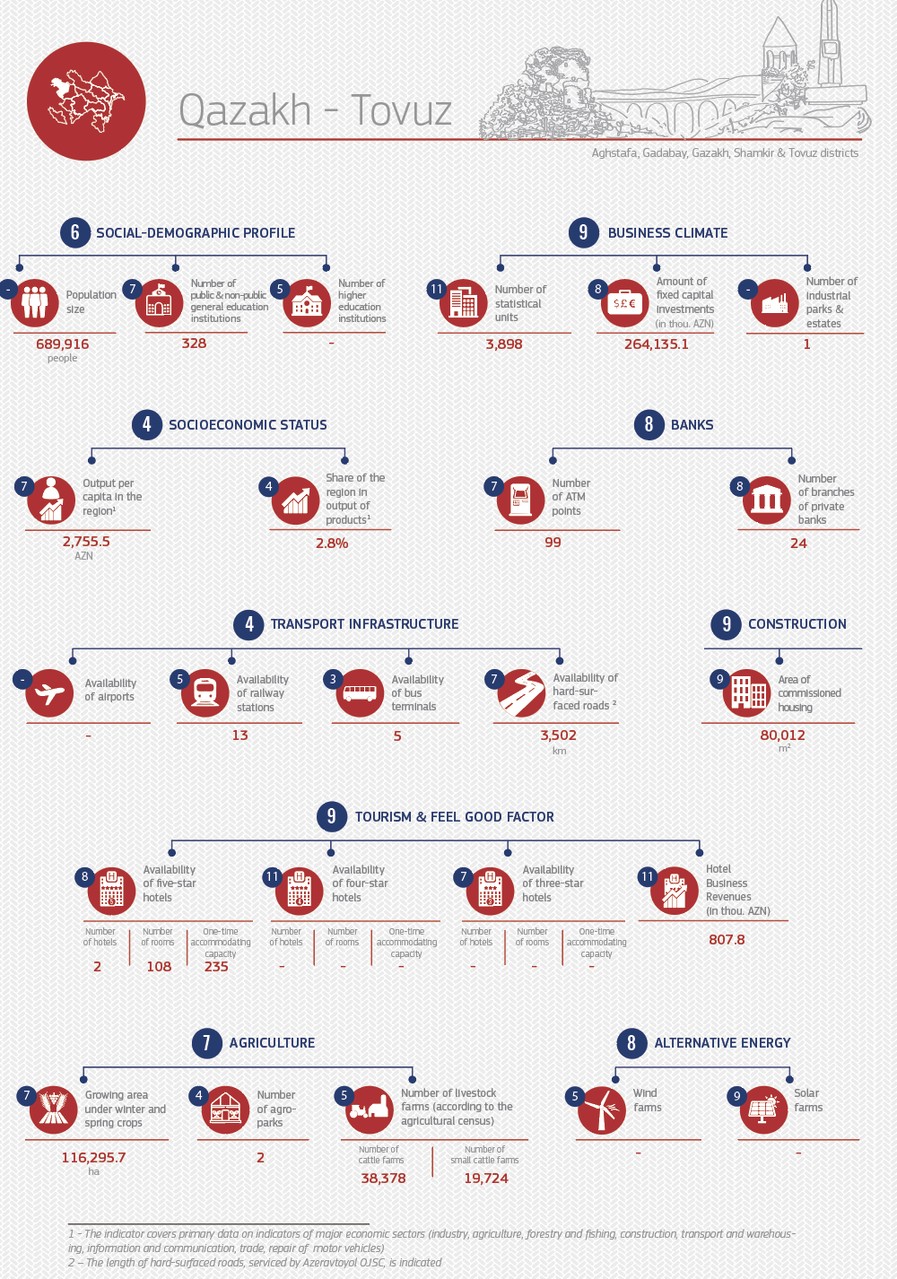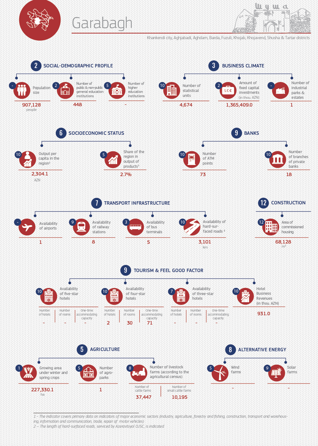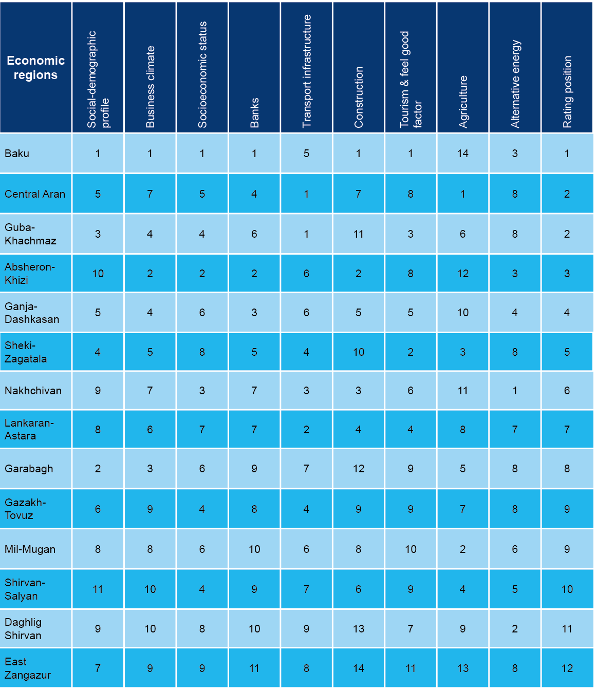 According to the final results of the 14-point assessment, Guba-Khachmaz and Central Aran regions share the second place after Baku. Coming next on the third position by a small margin is Absheron-Khizi, Ganja – Dashkasan comes fourth, the fifth place is taken by Sheki-Zagatala, the sixth by Nakhchivan, seventh - Lenkaran-Astara, eighth - Garabagh, ninth - Gazakh-Tovuz and Mill-Mugan, the tenth place is taken by Shirvan Salyan, the eleventh by Daghlig Shirvan, and the twelfth by East Zangazur.