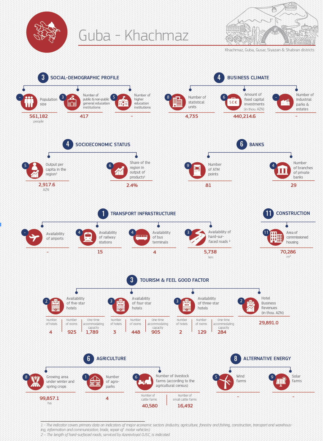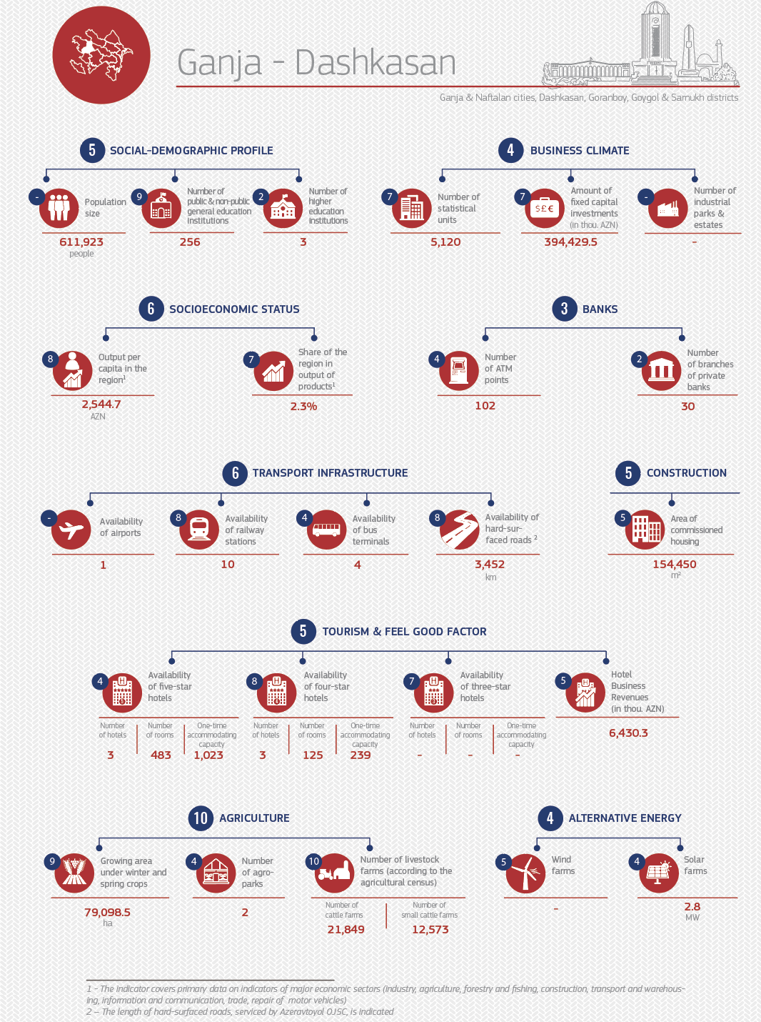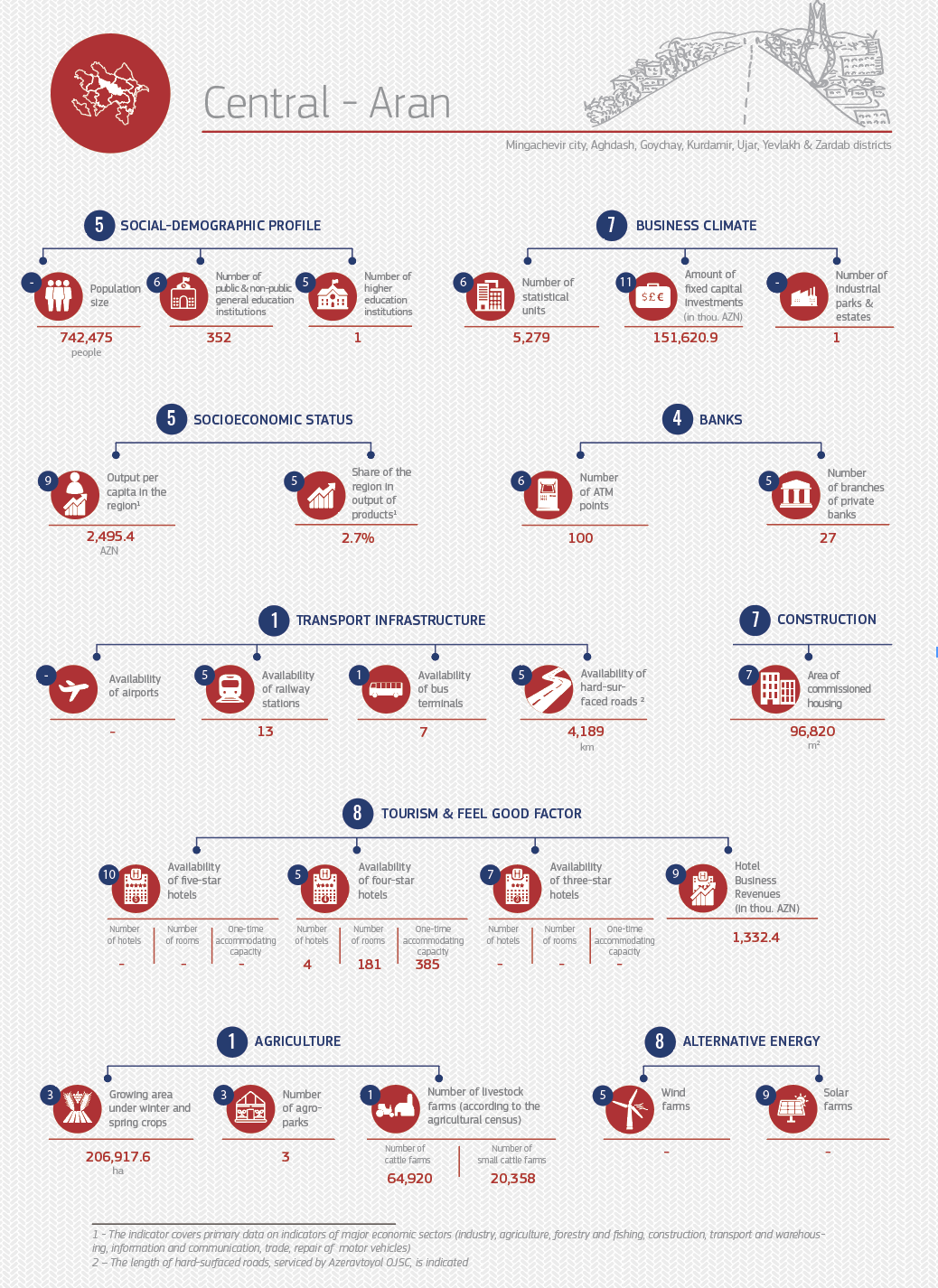 According to the final results of the 14-point assessment, Guba-Khachmaz and Central Aran regions share the second place after Baku. Coming next on the third position by a small margin is Absheron-Khizi, Ganja – Dashkasan comes fourth, the fifth place is taken by Sheki-Zagatala, the sixth by Nakhchivan, seventh - Lenkaran-Astara, eighth - Garabagh, ninth - Gazakh-Tovuz and Mill-Mugan, the tenth place is taken by Shirvan Salyan, the eleventh by Daghlig Shirvan, and the twelfth by East Zangazur.