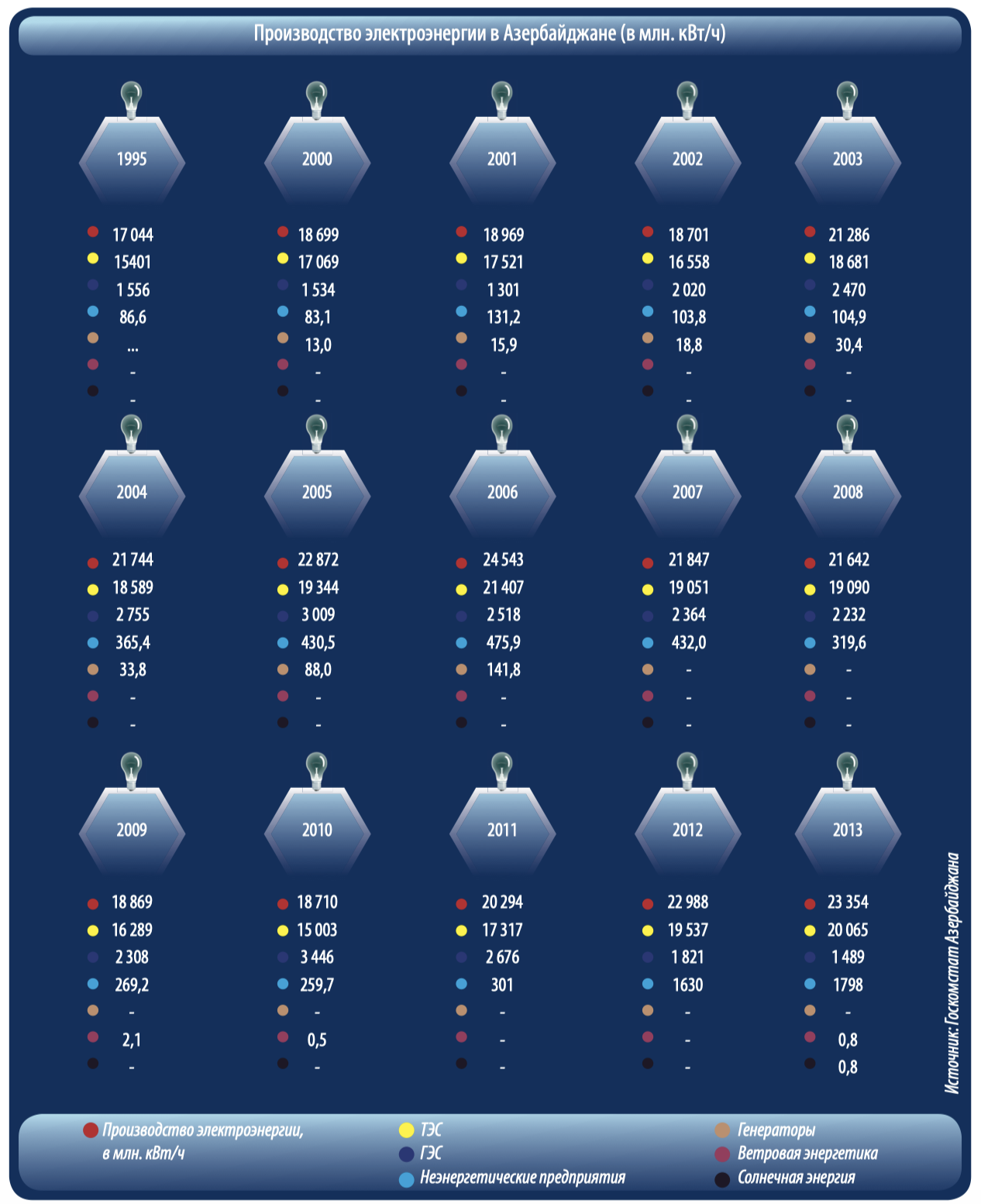 Проведенные в этой области исследования выявили, что в Азербайджане есть потенциал сэкономить почти 40% общих потребностей в энергоресурсах. Благодаря строительству и вводу в эксплуатацию экономных электростанций, реконструкции физически устаревших энергоблоков, а также использованию в выработке энергии природного газа на уровне 97,8% за последние десять лет расход топлива на производство 1 киловатт-часа электроэнергии сократился с 413 грамм до 303,7 грамма по итогам 2013 года, то есть более чем на 25 процентов. Это позволило сэкономить за год примерно 2 миллиона тонн условного топлива.