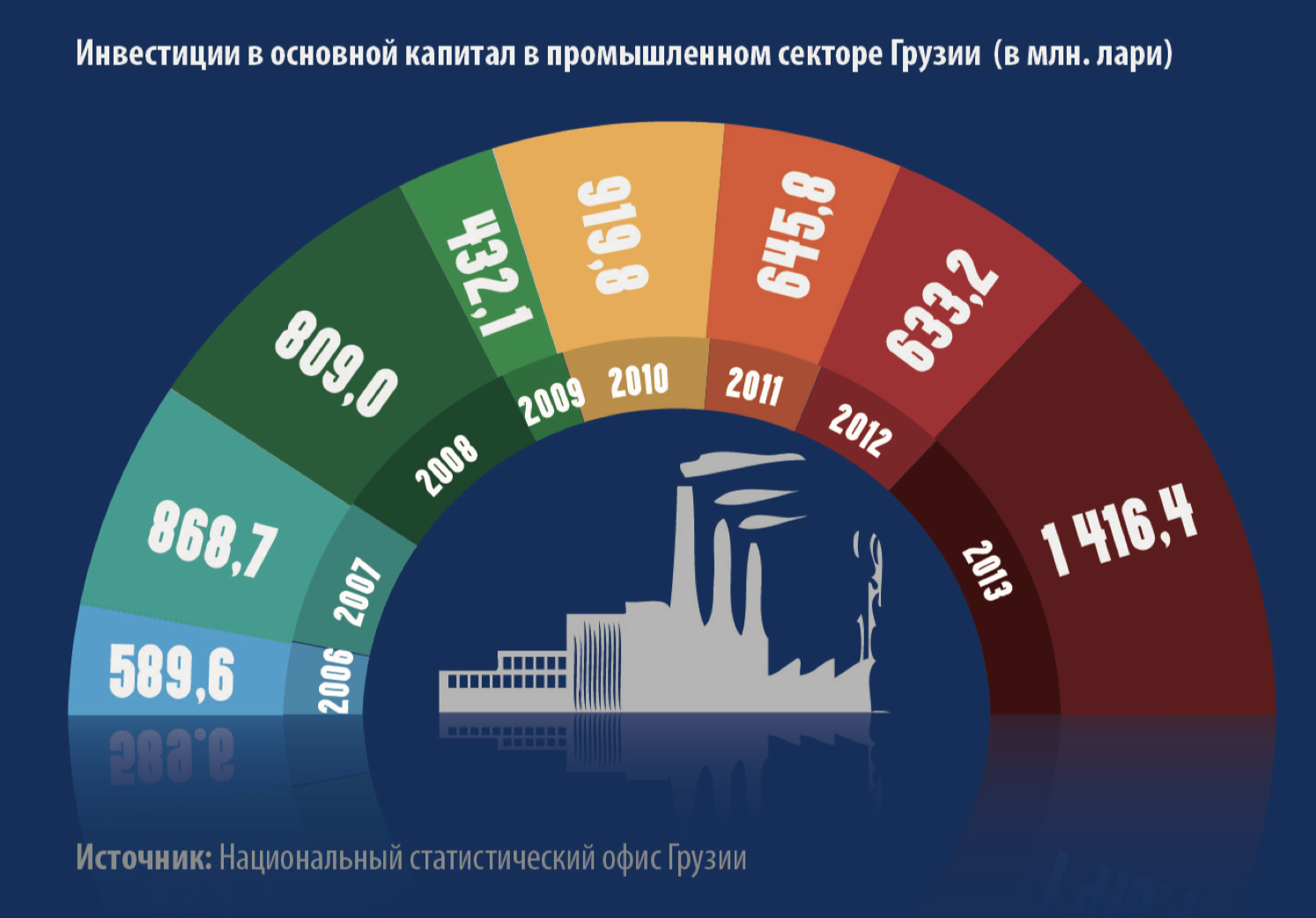 На долю перерабатывающей промышленности приходится 38,4% от общего объема прямых иностранных инвестиций, вложенных в экономику Грузии за апрель-июнь 2014 года – 58 миллионов долларов, что на 12 миллионов долларов больше, чем за первый квартал 2014 года и на 30 млн долларов больше чем за второй квартал 2013 года.