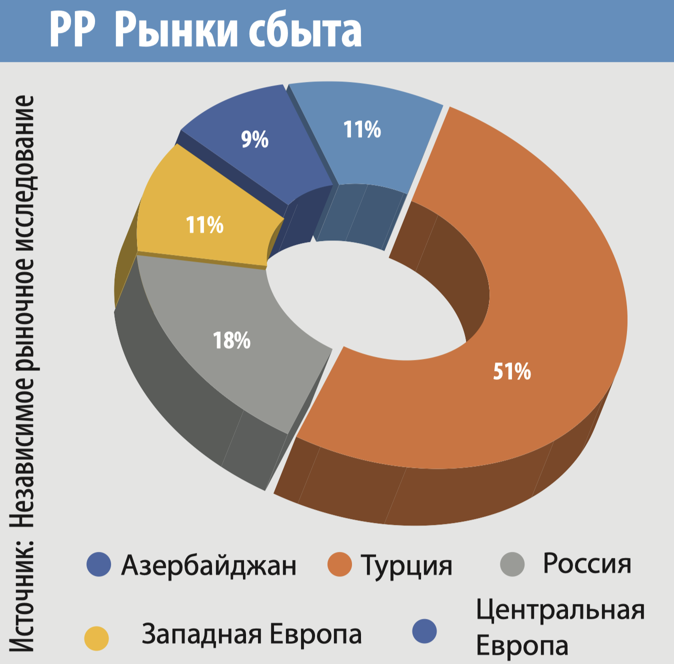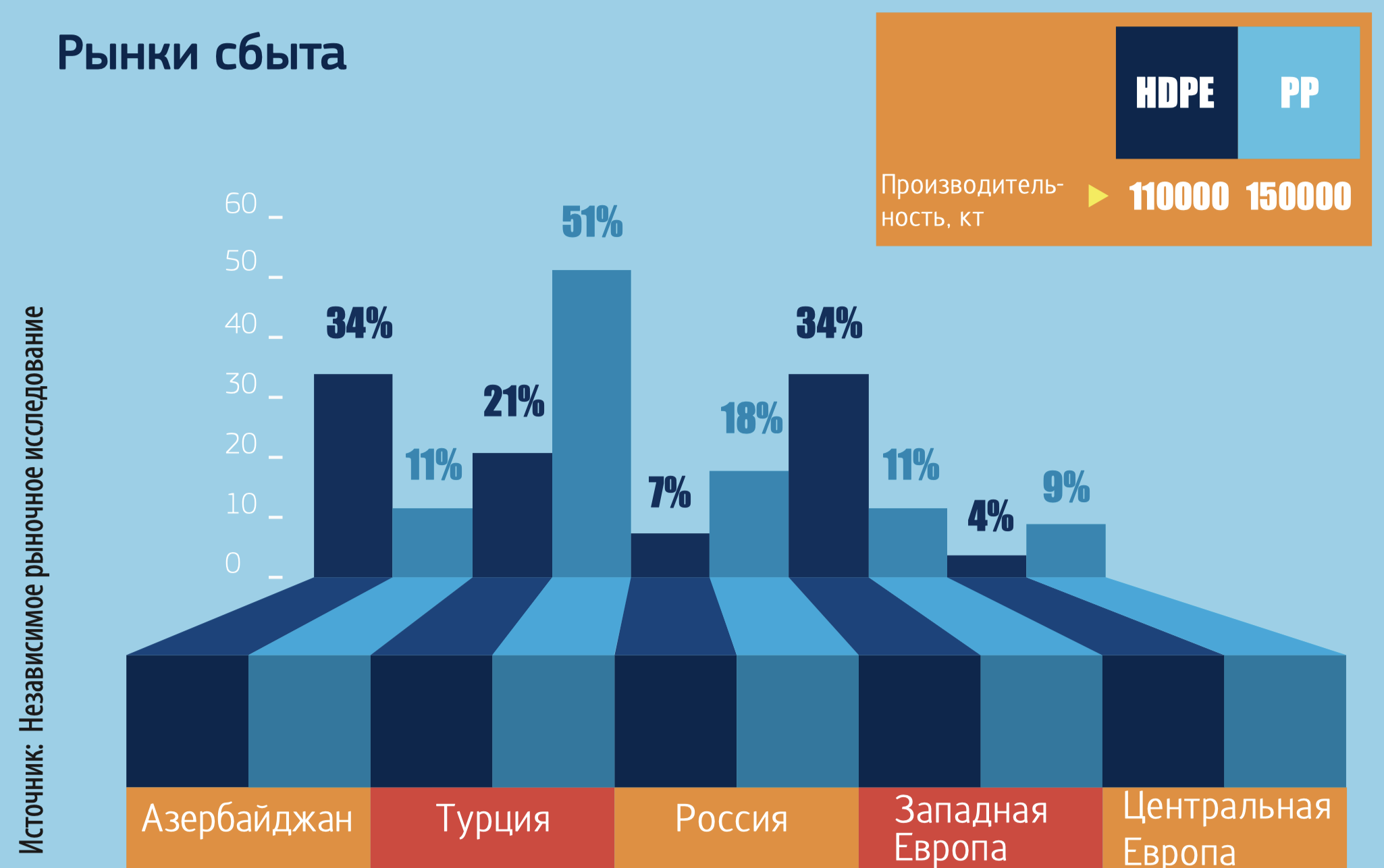Максимальная мощность полипропиленового завода составит 180 тыс. тонн, а полиэтиленового – 120 тыс. тонн. Из всего этого сырья на внутренний рынок будет направлено около 30-40% произведенной продукции. Этого будет достаточно для полного обеспечения внутреннего рынка. Остальная часть пойдет на экспорт. Основным рынком для экспорта рассматривается Турция, где азербайджанская продукция конкурентоспособна. Надо отметить, что по заказу SOCAR Polymer был проведен мониторинг всего регионального рынка на предмет конкурентоспособности продукции SOCAR Polymer. Результаты мониторинга показали конкурентоспособность азербайджанской продукции. И в особенности на турецком рынке, который сам по себе достаточно большой (2,3 млн. тонн потребления в год). Однако на сегодняшний день 50% продукции на турецкий рынок доставляется ненефтяными странами, которые закупают нефтепродукты, перерабатывают их и продают. В Азербайджане же производственная цепочка является более интегрированной, что скажется на низкой себестоимости продукта, и таким образом, сделает ее более конкурентоспособной.