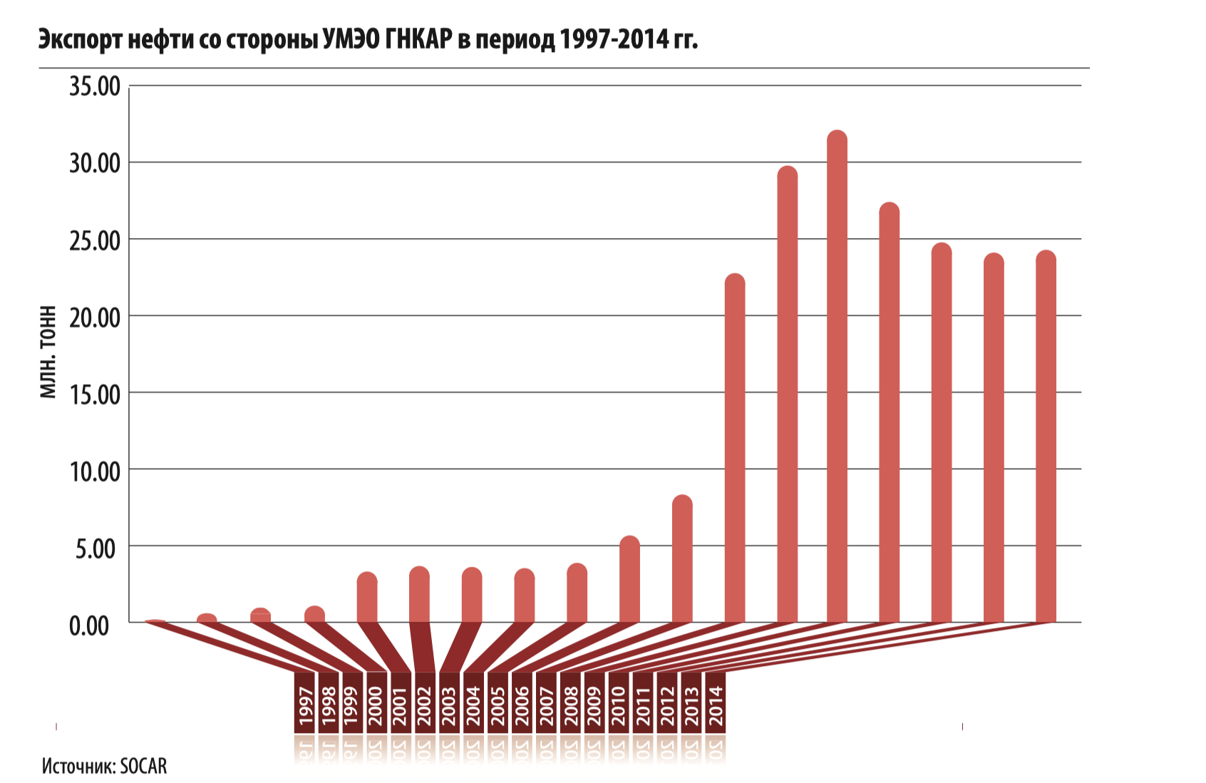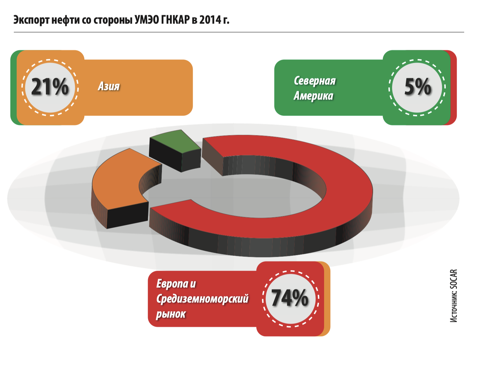 В 2014 году в рамках экспортных соглашений УМЭО было экспортировано 24,5 млн. тонн сырой нефти. Крупные объемы экспорта сырой нефти укрепляют позиции азербайджанской нефти на мировом рынке, выдвигают на передний план необходимость рациональной организации экспорта и требуют проведения в этом направлении гибкой и сбалансированной маркетинговой политики. В этой связи актуальным вопросом является обеспечение прямых связей с покупателями нефти и крупными нефтепереработчиками, а также поставка азербайджанской нефти на новые перспективные рынки.