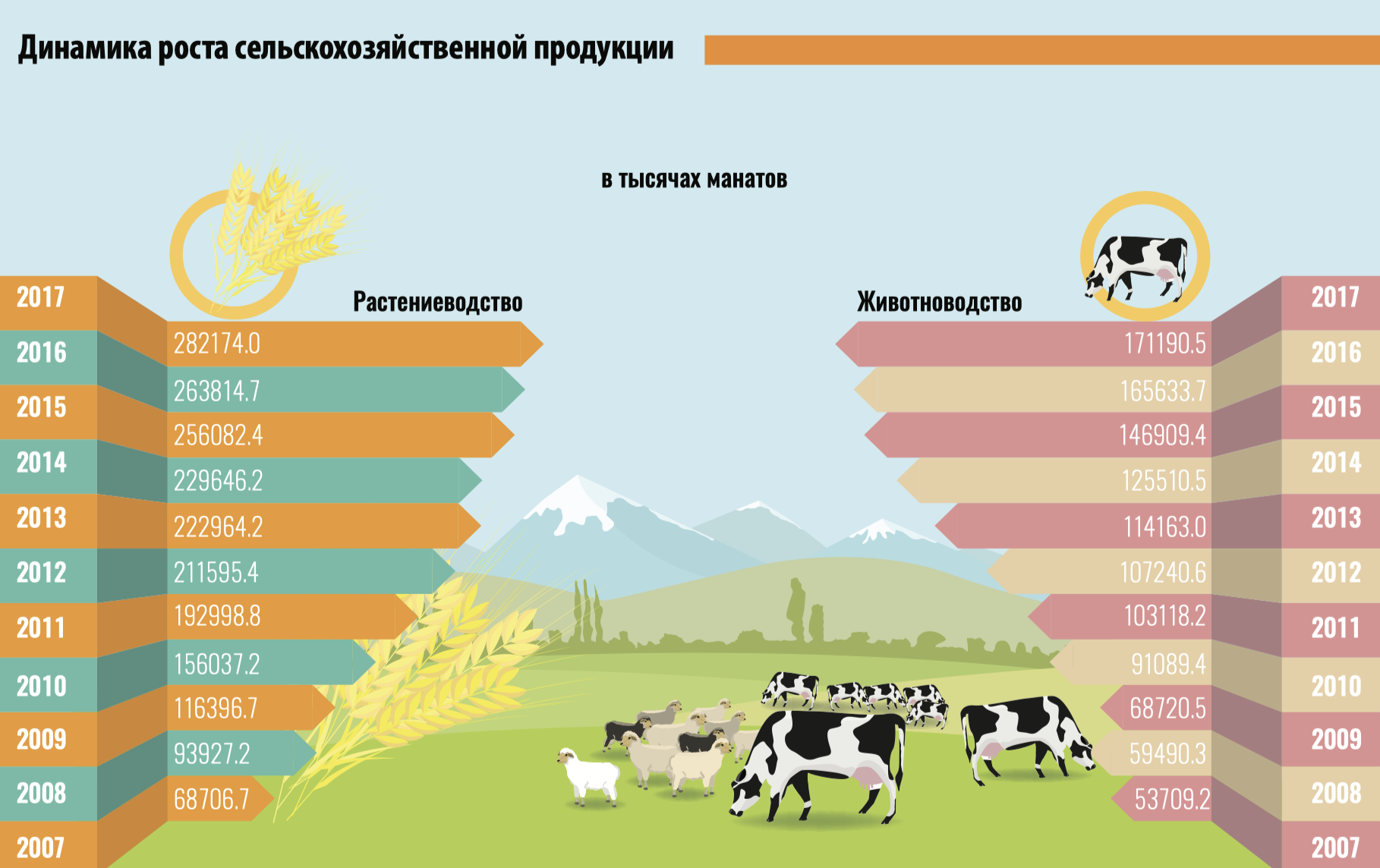 Мероприятия, предпринятые в области развития сельского хозяйства обеспечили динамичный рост производства продукции, в 2017-ом году в Автономной Республике была произведена сельскохозяйственная продукция стоимостью более чем 453 миллионов манатов, причем 282 миллионов манатов из общей стоимости продукции пришлись на долю отрасли растениеводства, а 171 миллион манатов - на долю отрасли животноводства.